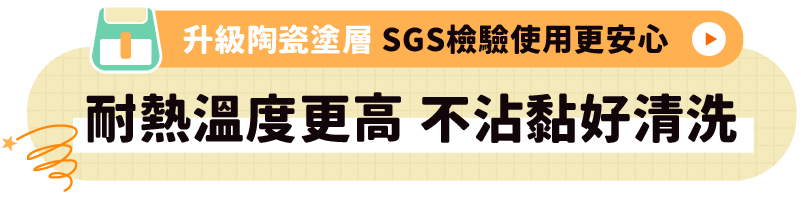 採用安全耐熱陶瓷塗層,不沾黏好清洗,符合 SGS 安全檢驗,全家人使用更安心。