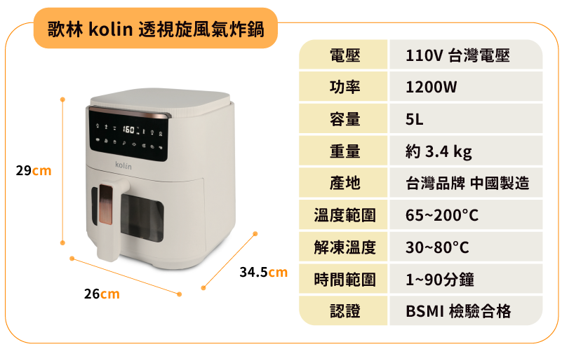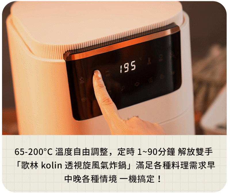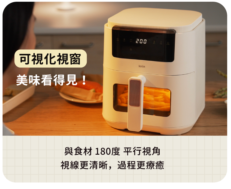 歌林透視旋風氣炸鍋,打造 360 度氣旋熱循環,讓烘烤受熱更均勻,有效減油 90%,健康美味輕鬆出爐,八種智能觸控菜單,65~200°C 範圍,火力自由調整,安全保護開關,炸籃取出自動停止。