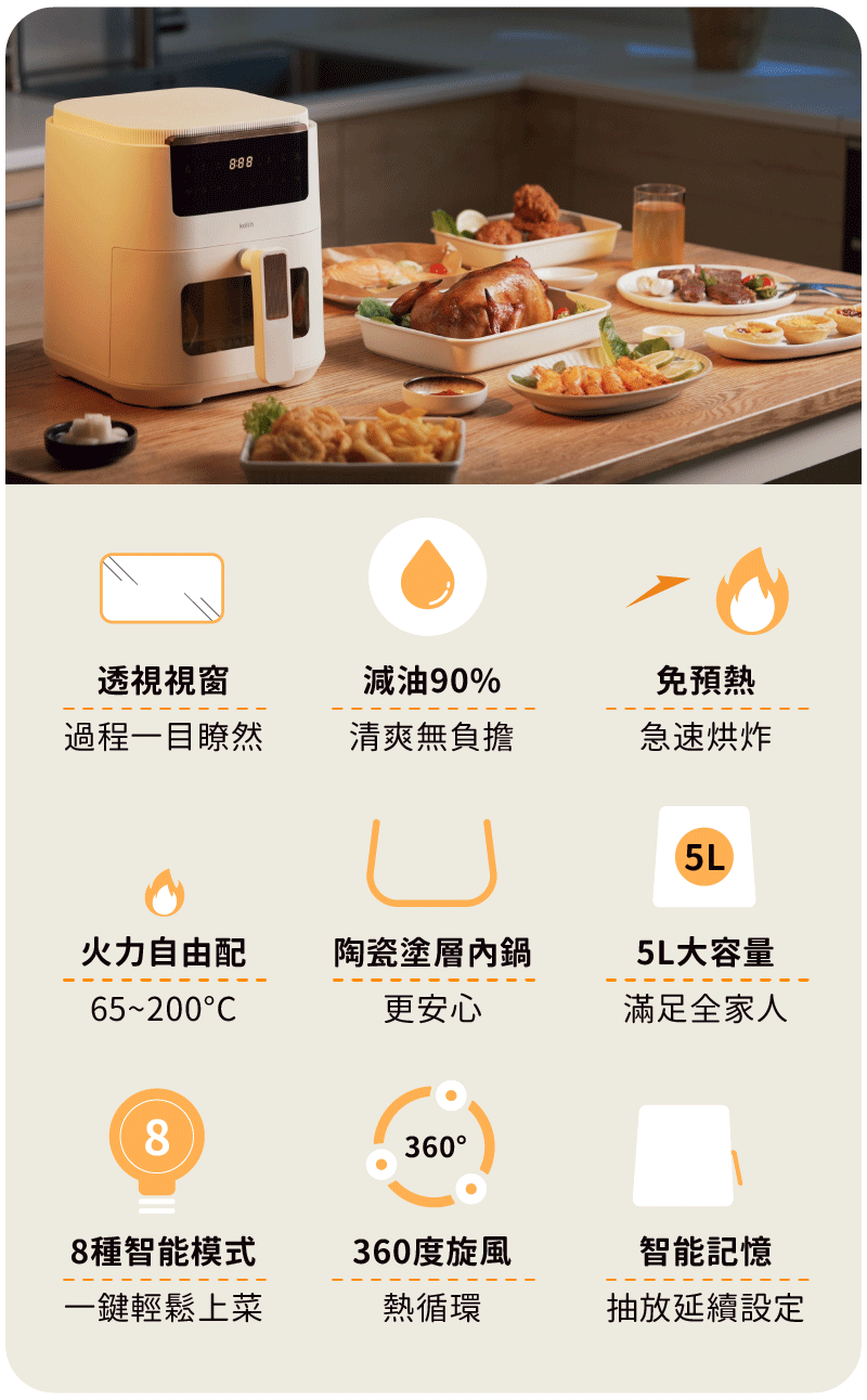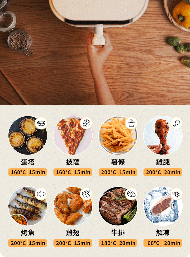 擁有八種種智能菜單,一鍵啟動,高溫可達 200°C,可依需求自由調節溫度,多樣化異國料理樣樣行。