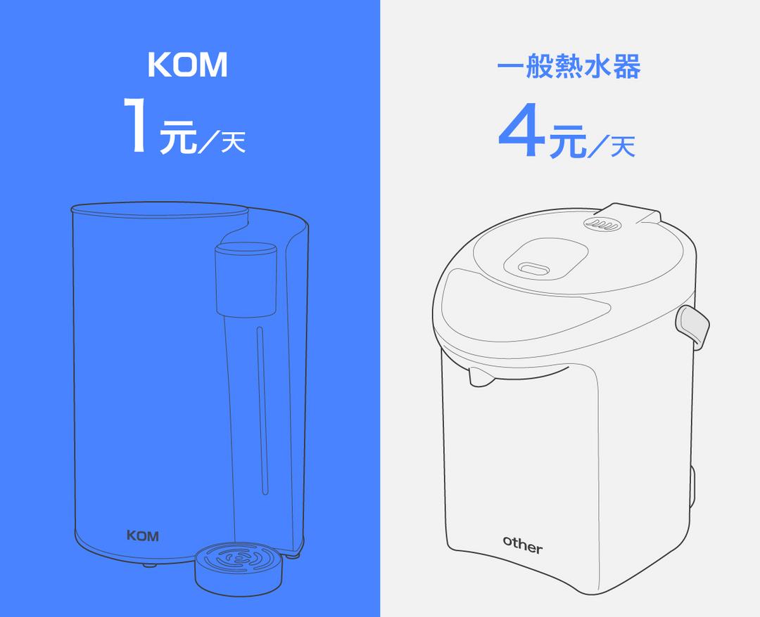 過去 24 小時插著熱水瓶,收到電費總是倒吸一口氣。KOM 瞬熱式智能飲水機,只在您需要的時候才啟動。每天僅要 1 元的電費,為您的荷包做最嚴格的控管。