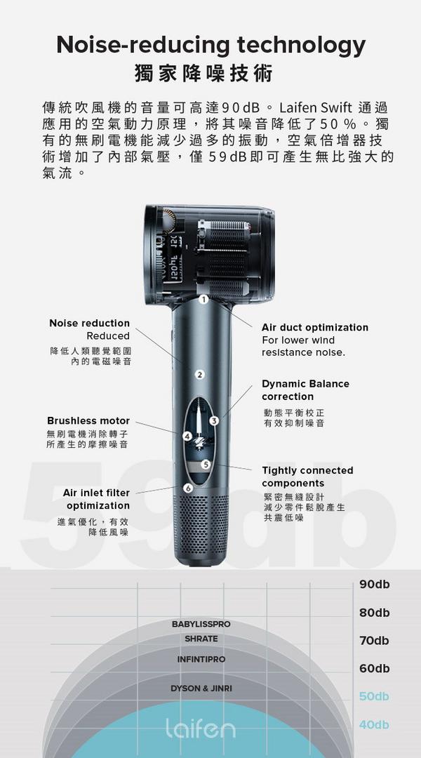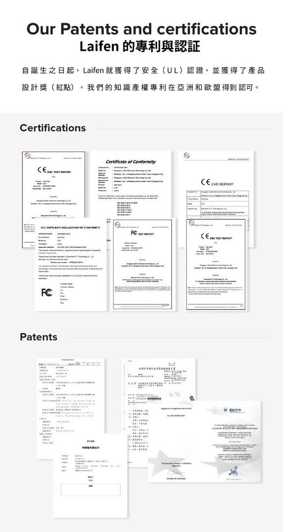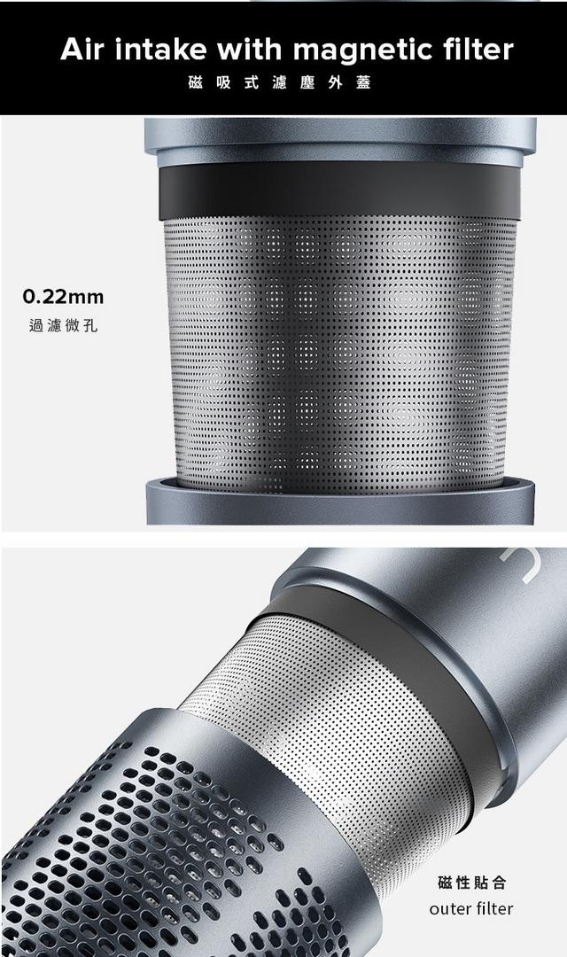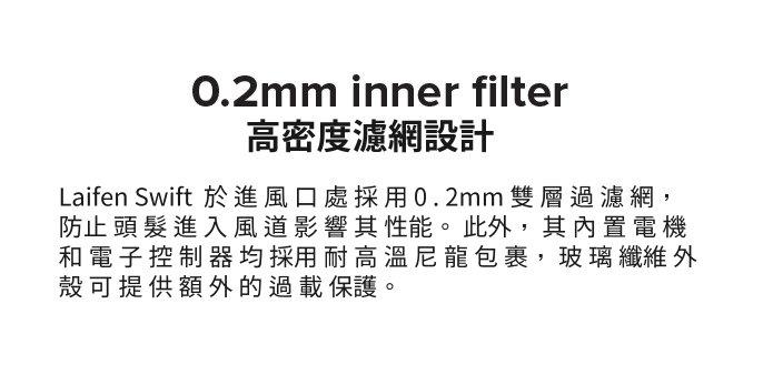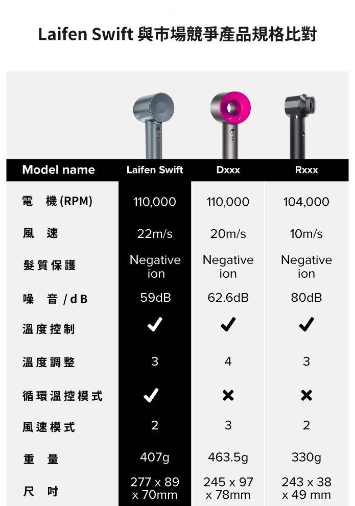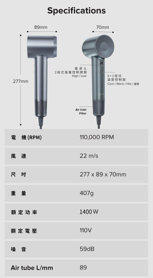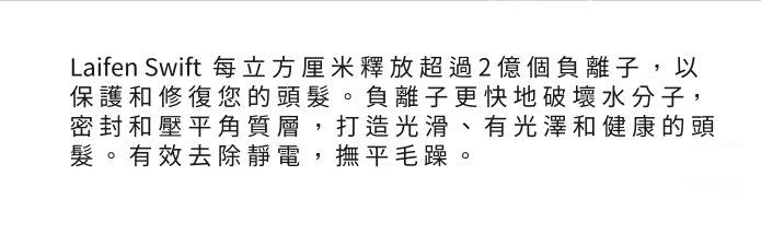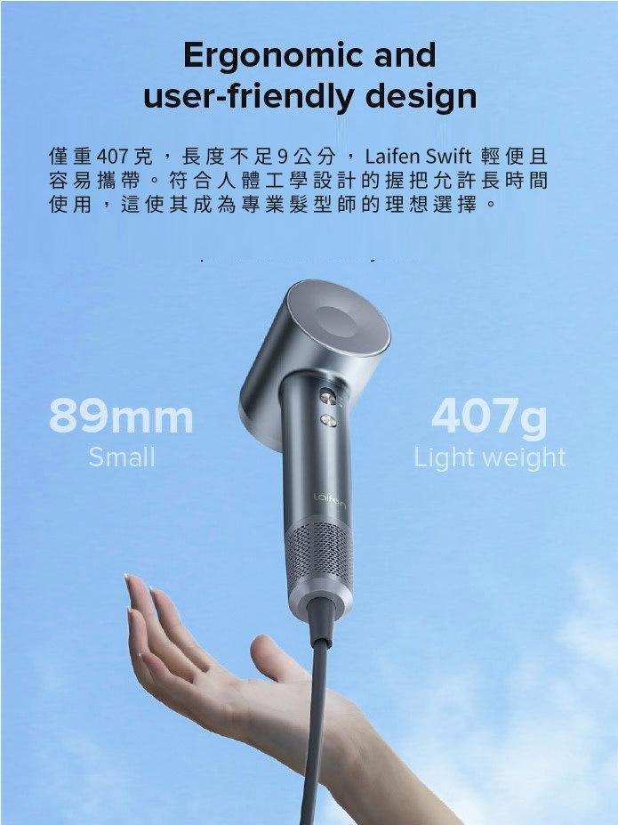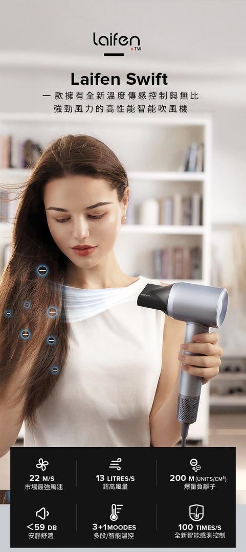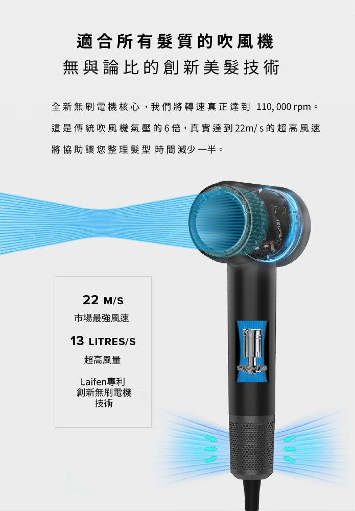 採用徠芬創新技術,將 110000 轉馬達技術完美物化,節省一半頭髮乾燥的時間;100 次/秒溫度感測器和微處理器控制,含有 200,000,000 個負離子/cm3,可增強頭髮的光澤和光滑度,並減少毛躁和乾澀;0.2mm 超密濾網有效防止頭髪異物吸入,體積小巧,外出攜帶更方便!