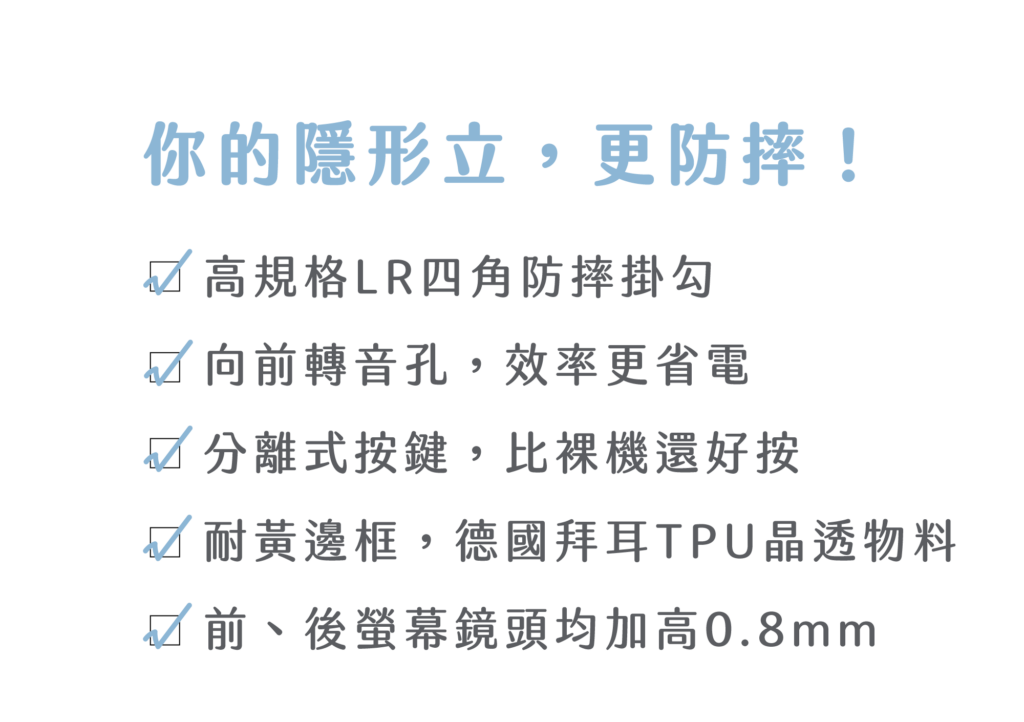獨家專利雙層殼採用「歐盟級的防摔環保材質」,除了基本的防摔更能防重擊摔落,手機殼具有吸震軟層與防重擊抗震硬殼,手機就算從高高的衣櫃上掉落,必然完好如初。