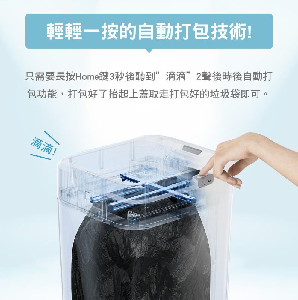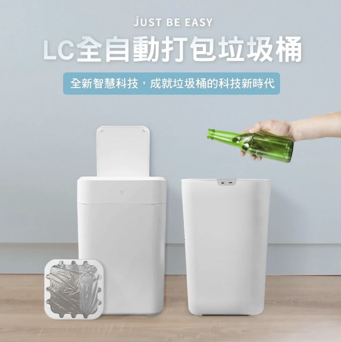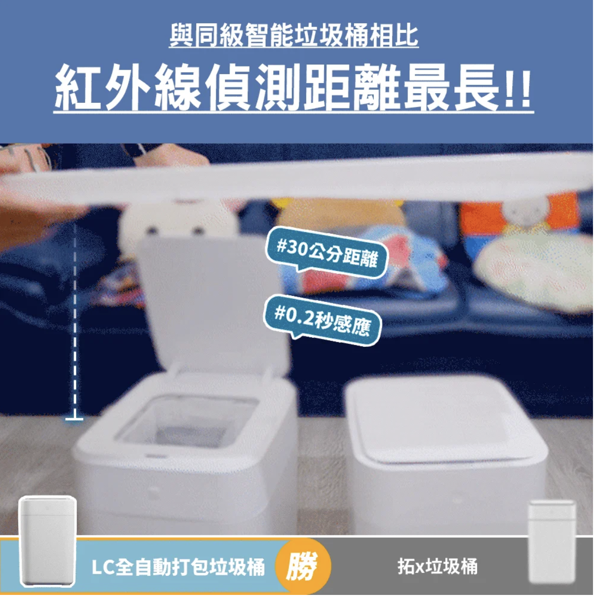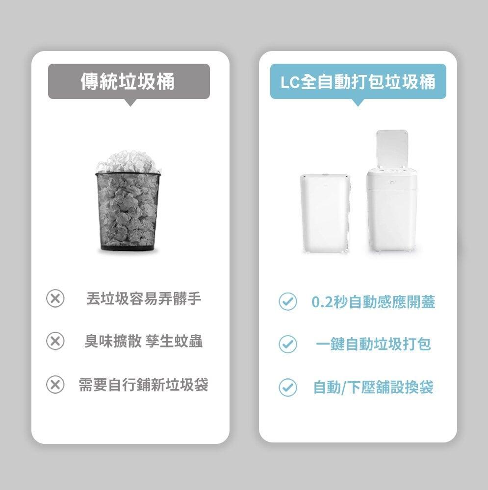 LC 全自動打包垃圾桶,讓您重新定義垃圾桶,30cm 長距離感應,搭配 0.2 秒快速感應、快速開蓋,獨家自動超載打包、垃圾滿出來不用怕,自動換垃圾袋,一鍵搞定,倒垃圾不髒手!