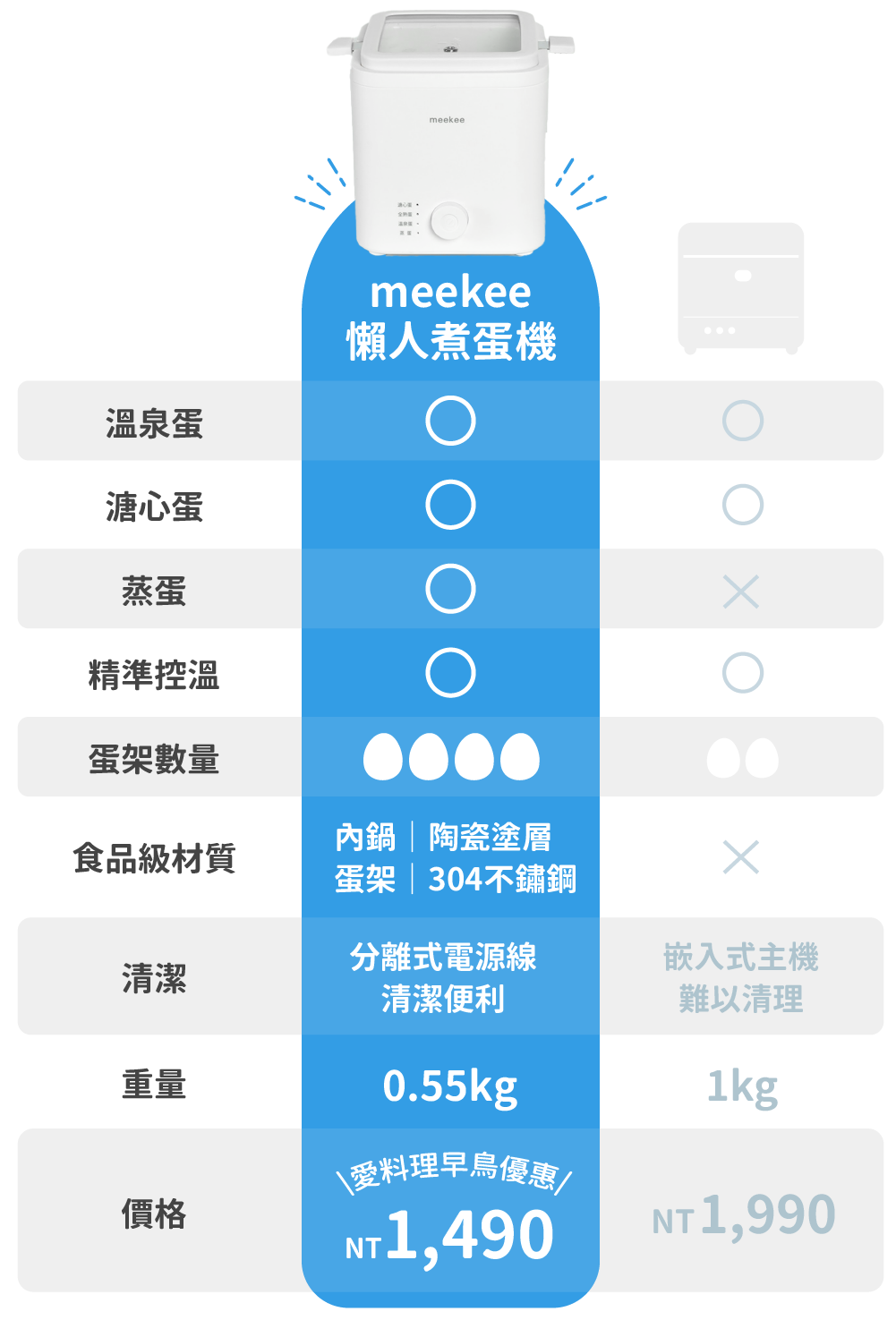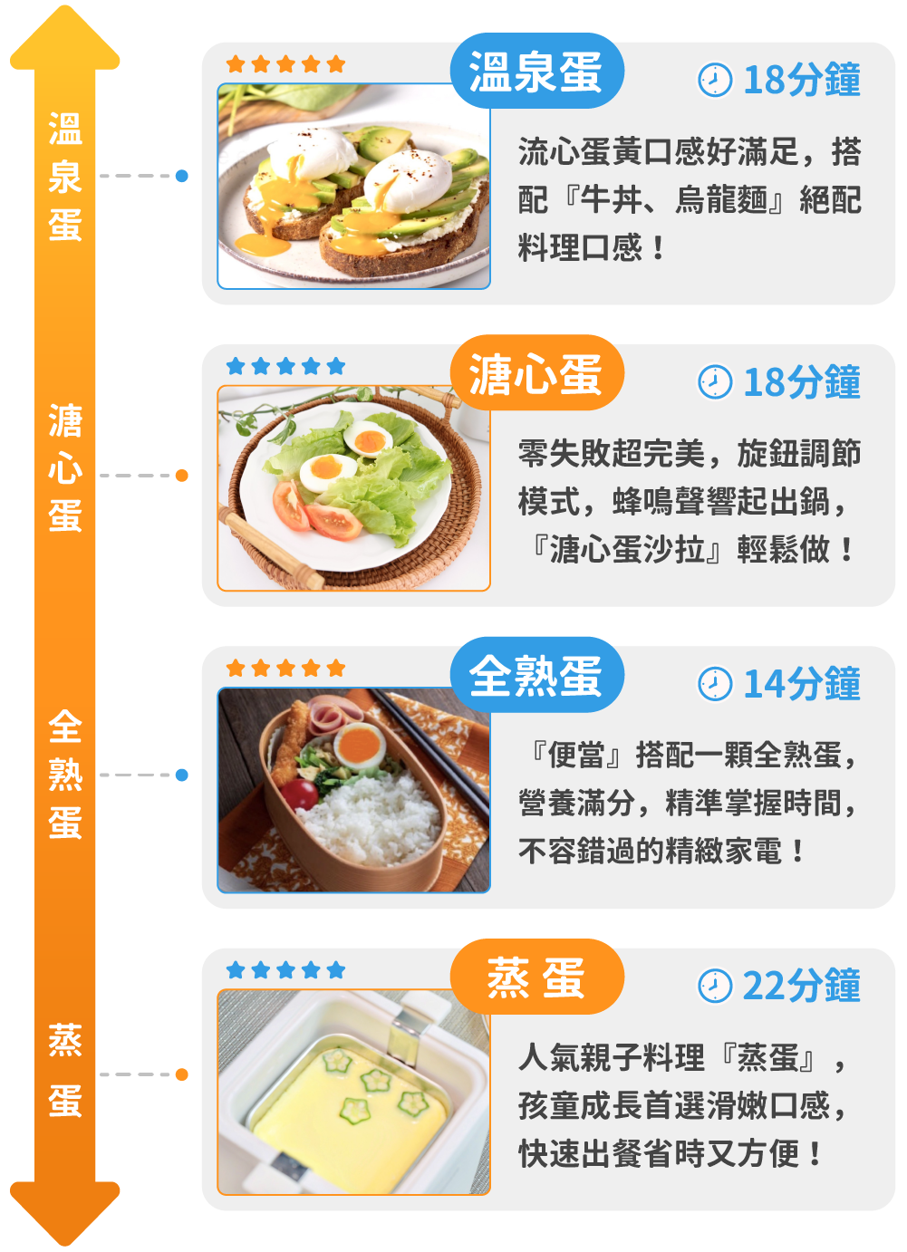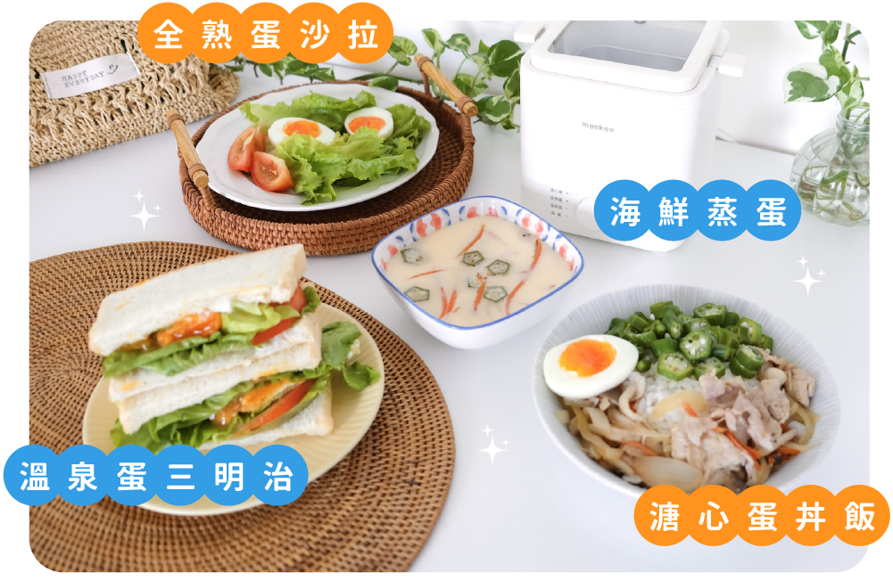 多樣化料理輕鬆做,海鮮蒸蛋、水煮蛋、溏心蛋、蒸蛋料理一機搞定,不用擔心火力大小、水量多寡,一鍵設定烹調行程,餐餐營養又健康。