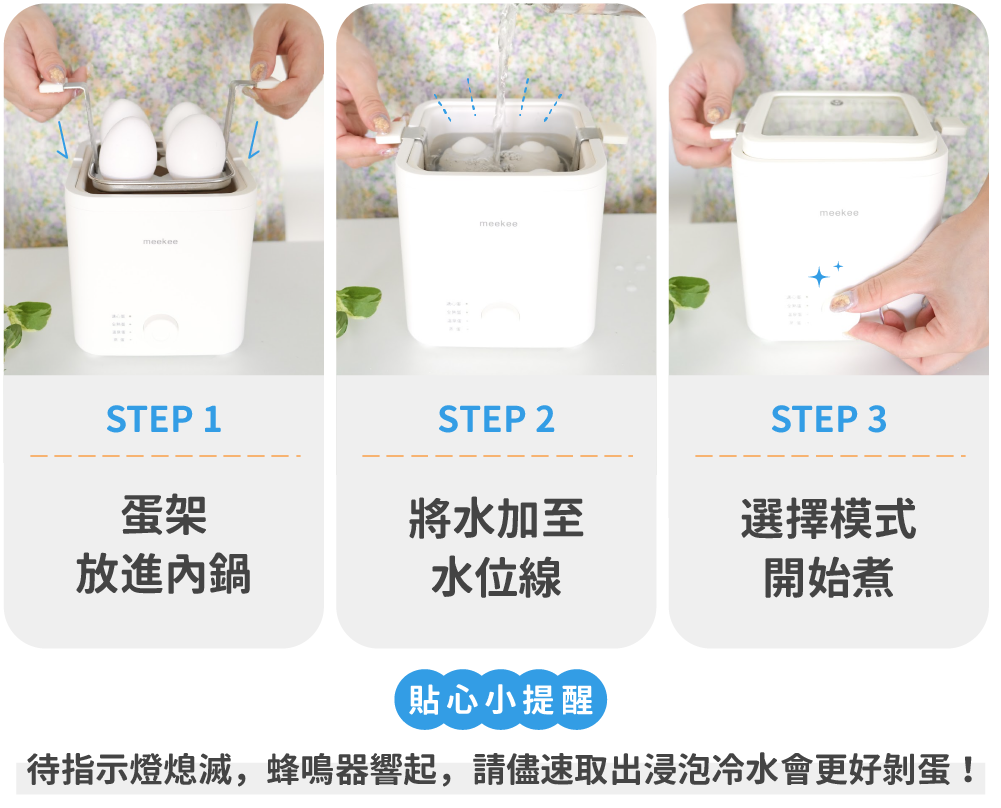 只要三步驟,將蛋架放入內鍋,將水加至水位線,選擇烹煮模式,即可煮出完美水煮蛋熟度。