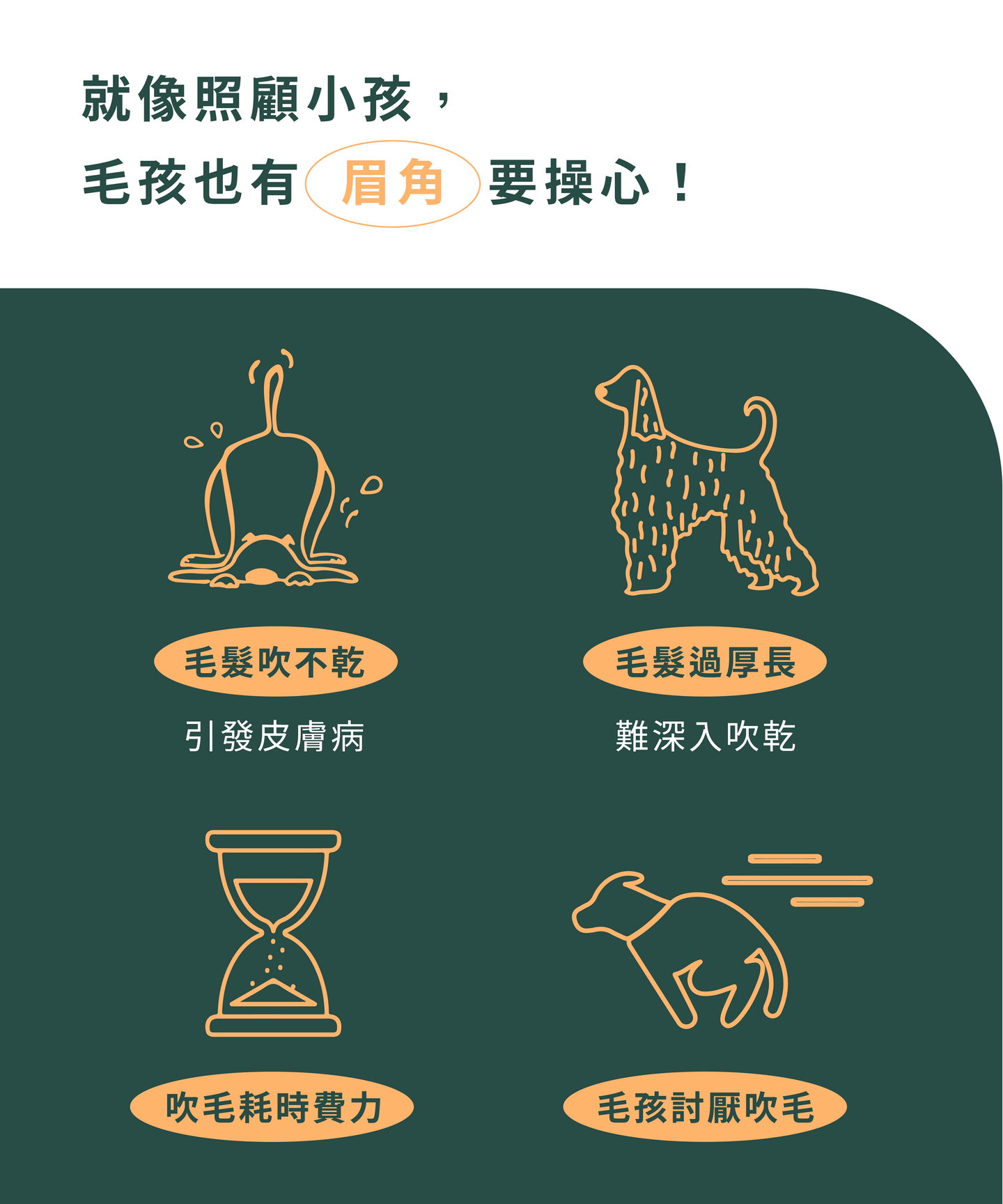 談到幫毛孩吹毛,是許多家長的惡夢。毛孩拼命掙扎亂跑,只能拿著沉甸甸的吹風機追著跑。雖然辛苦,但又絲毫不敢馬虎,深怕一不注意沒吹乾,家裡的寶貝就皮膚出狀況。