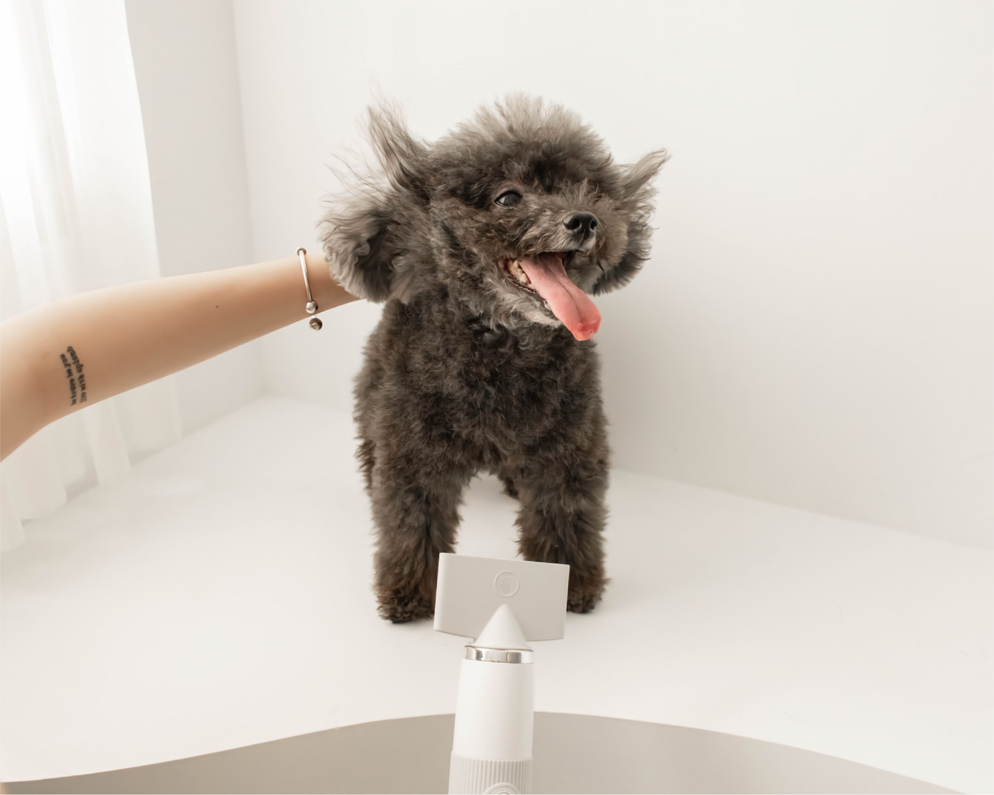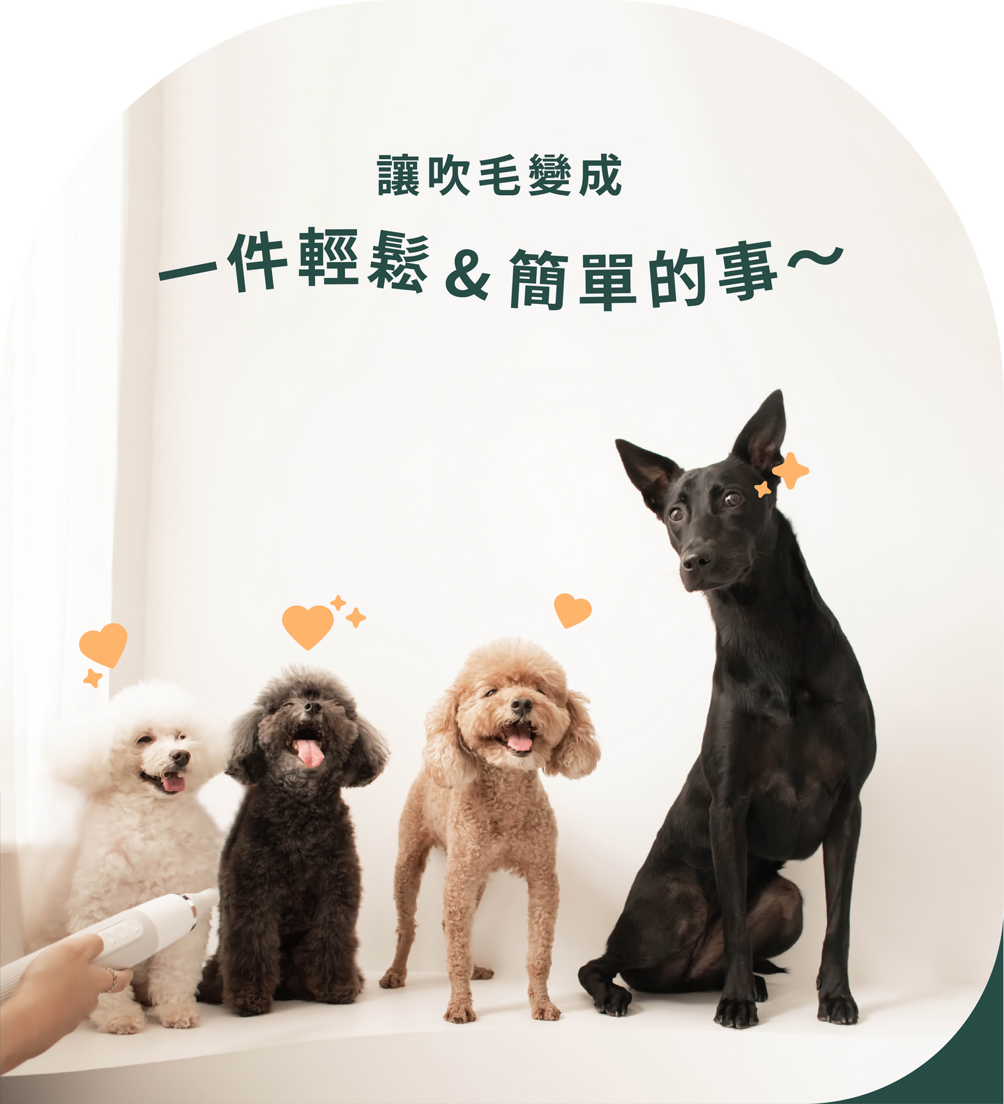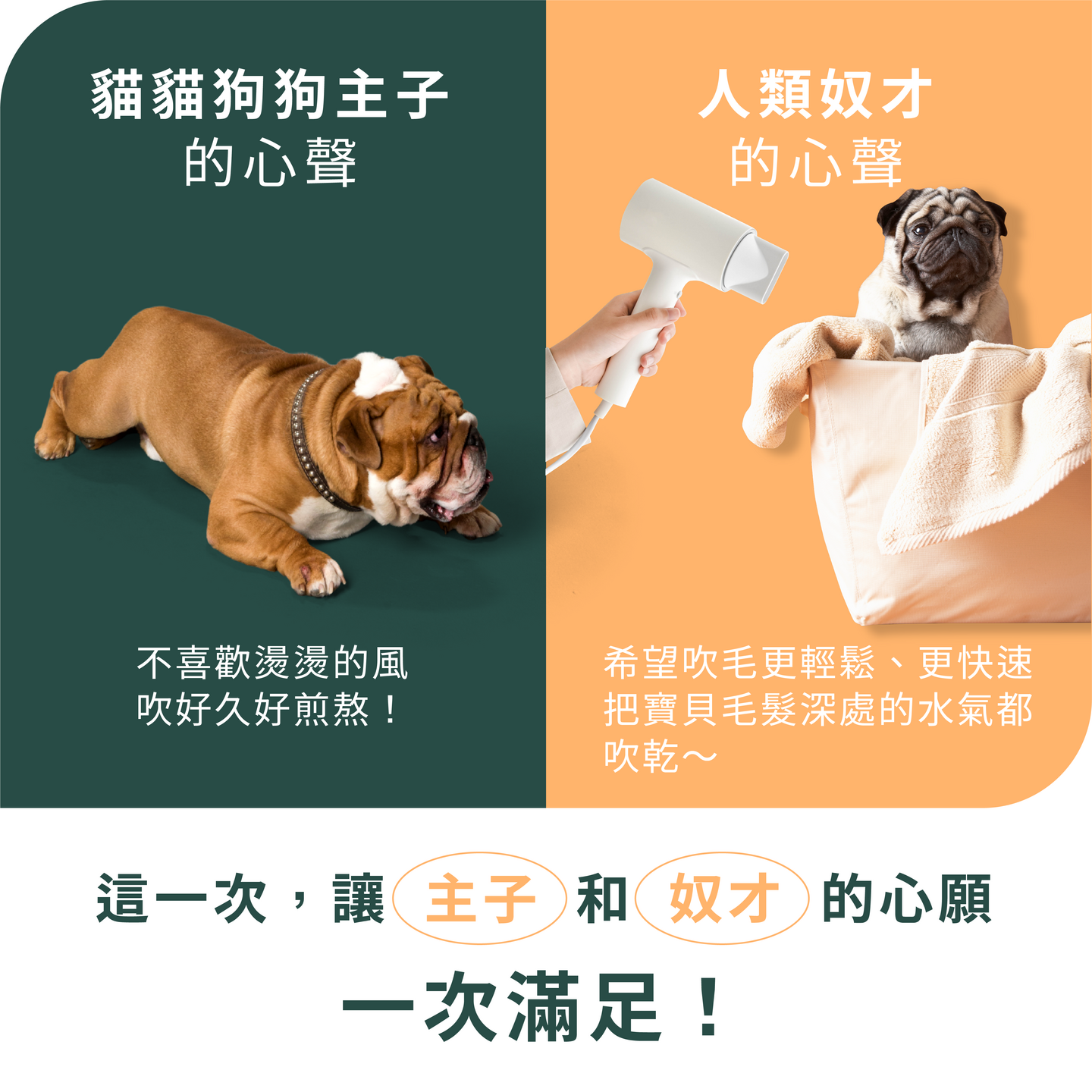 翻轉傳統吹水機笨重形象,讓毛孩吹毛不緊張、奴才服務更輕鬆,打造第一支呵護毛孩、對奴才友善的寵物吹水機!