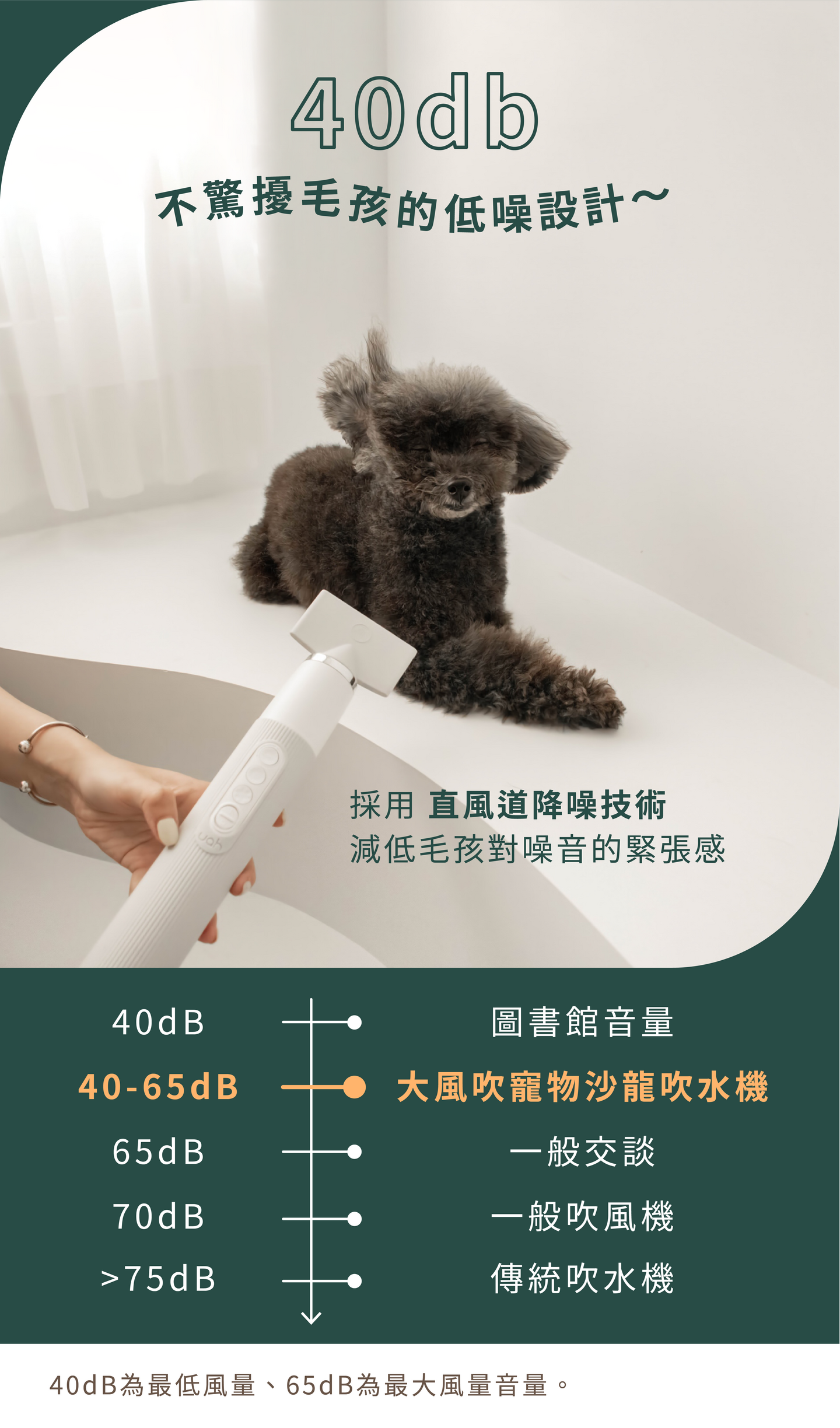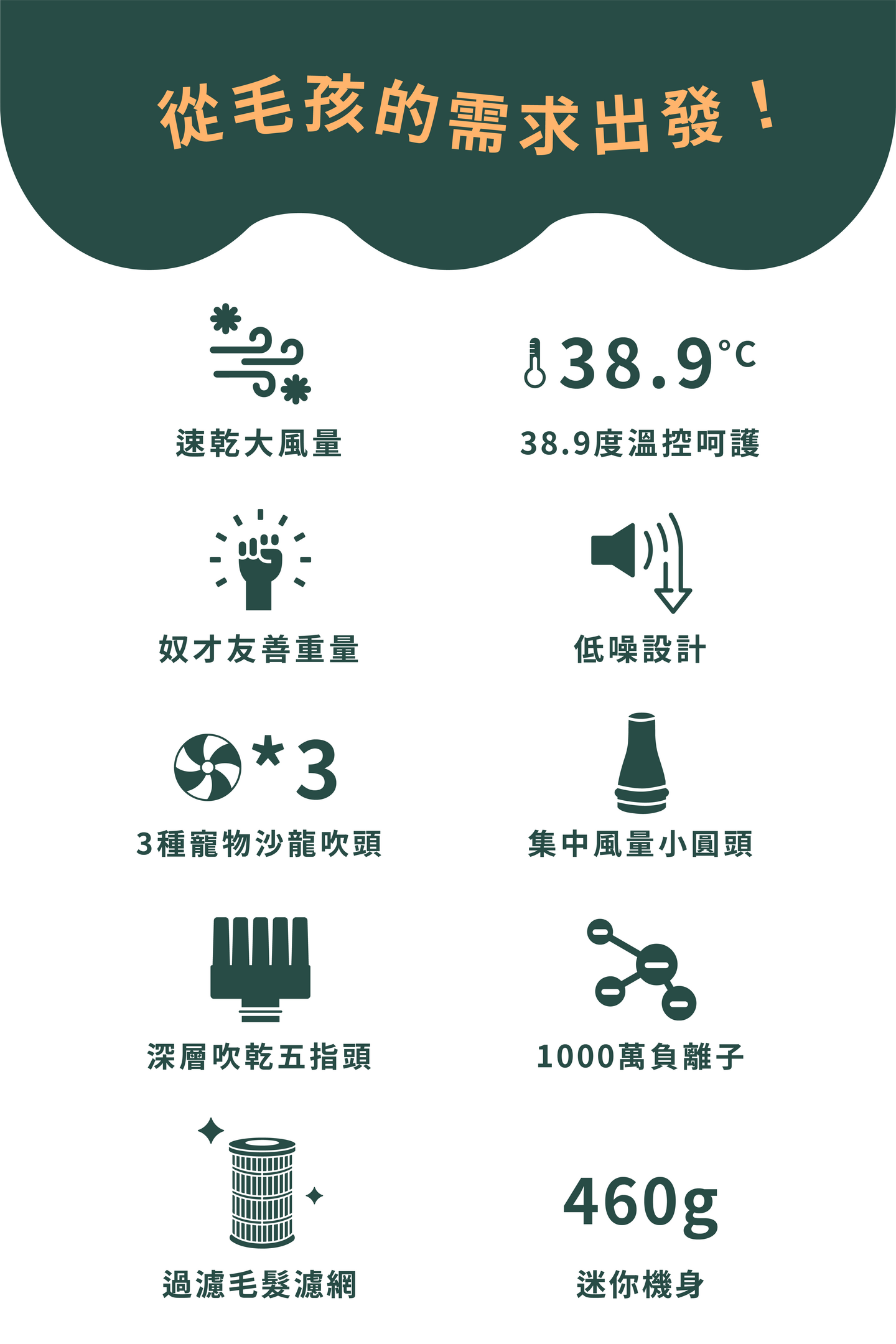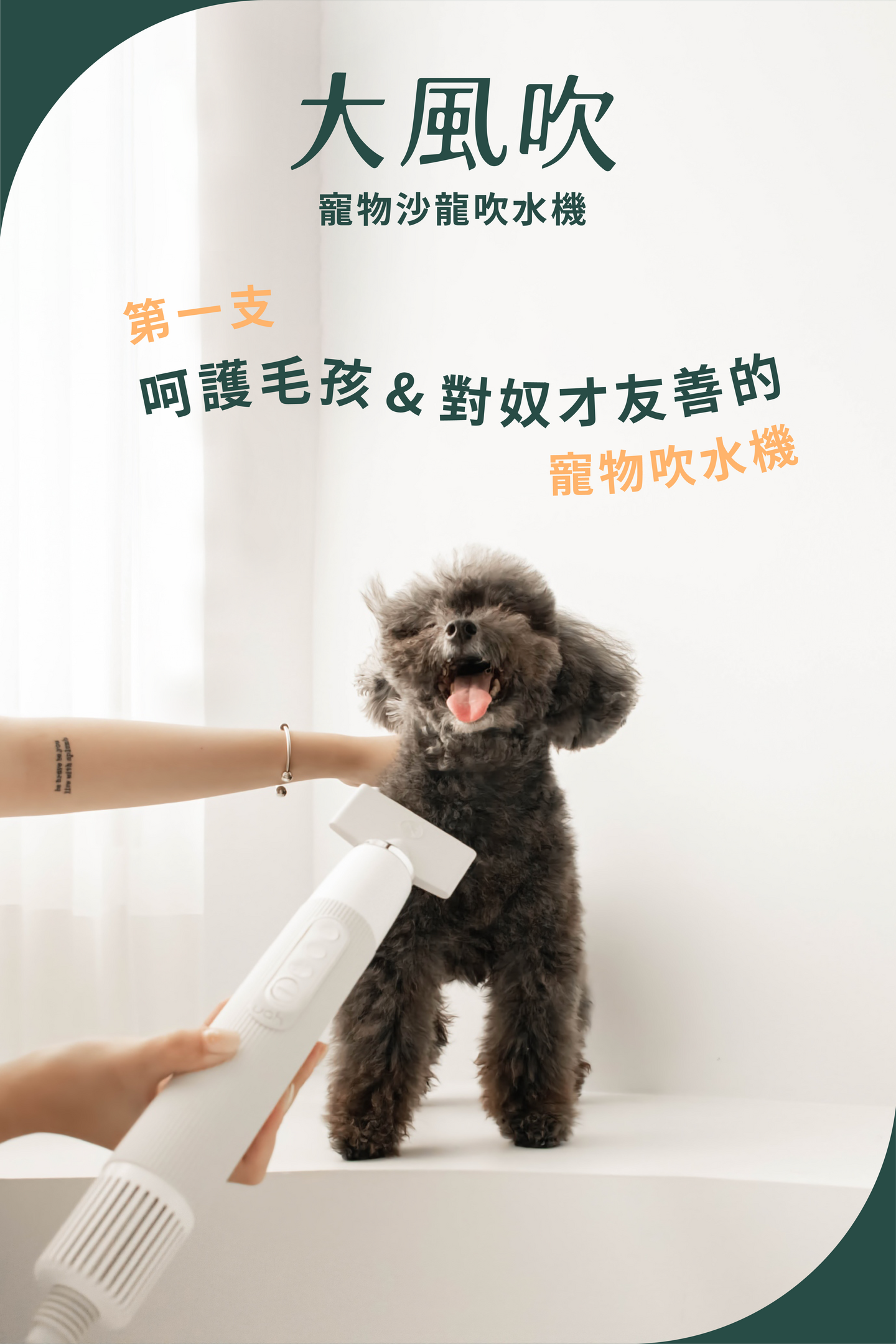 專為毛孩設計的大風吹寵物沙龍吹水機!深入毛髮的特殊吹頭,搭配特殊溫控大風量,保護寶貝們敏感的皮膚!