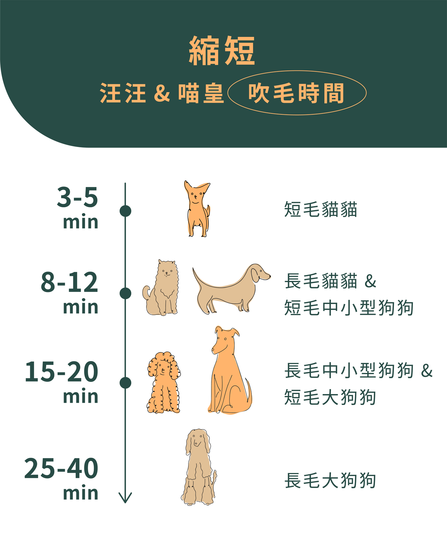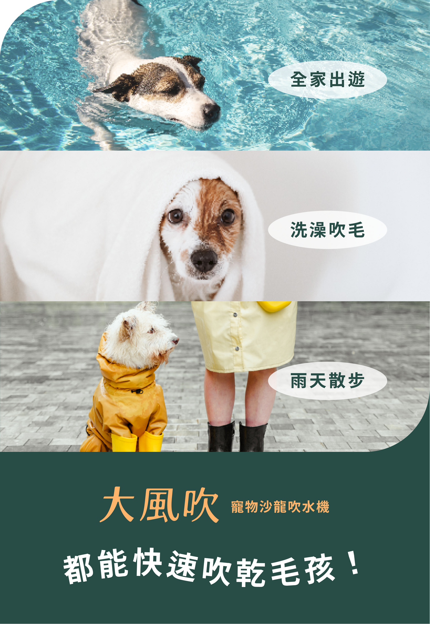 解決人類吹風機對毛孩不夠友善的設計,從多層毛、或是毛髮較長的貓貓狗狗們的需求出發,用大風吹寵物沙龍吹水機就能快速吹乾!