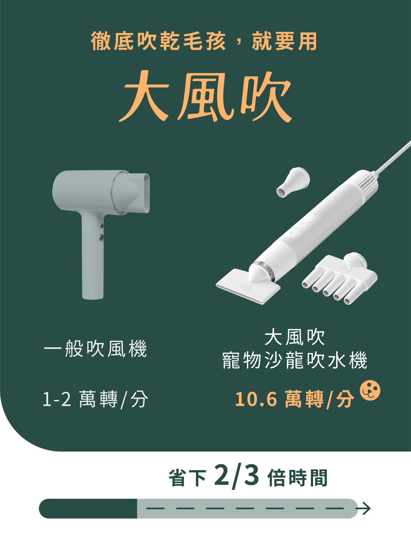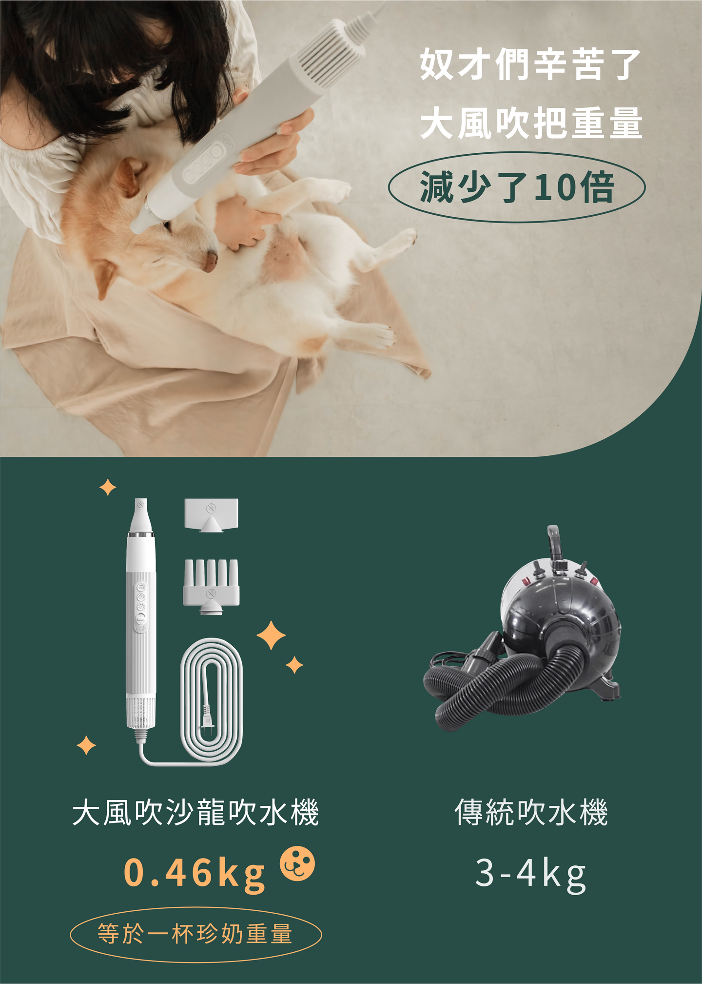 雖然是給毛孩的寵物吹風機,大風吹還是照顧到奴才們的福利,所以大風吹寵物沙龍吹水機把重量減少 10 倍,不再讓辛苦的家長們吹到手痠。