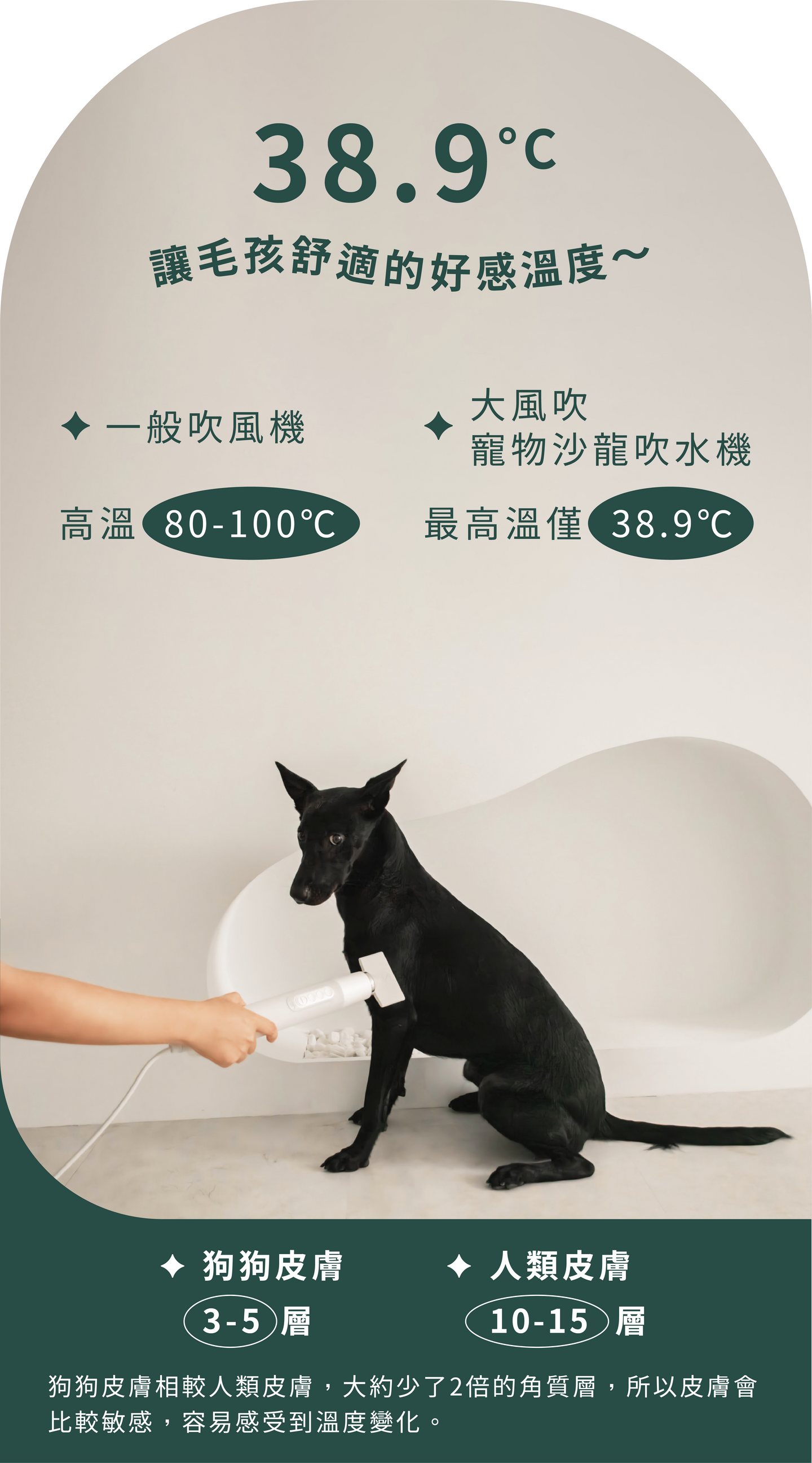 毛孩的皮膚角質層較薄,對溫度的感受相當敏感,因此大風吹寵物沙龍吹水機以 38.9 度溫控設計,搭配冷溫風循環,一年四季都適合使用大風吹,不擔心毛孩燙傷!