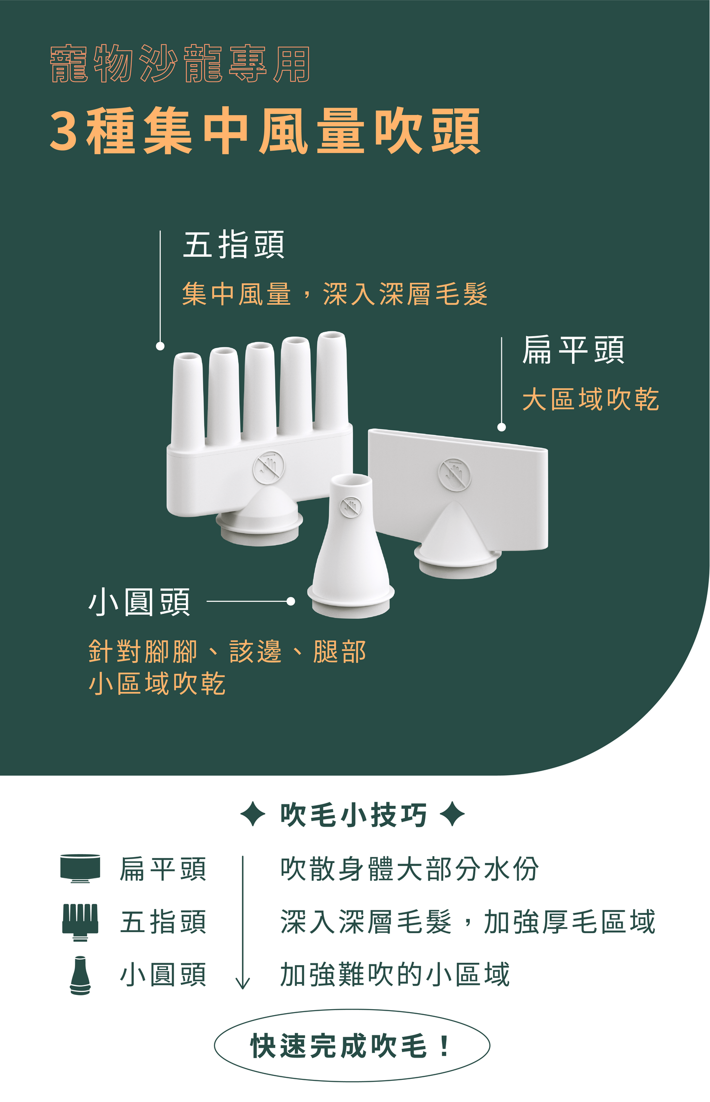 為了徹底把毛孩吹乾,大風吹寵物沙龍吹水機設計了三款寵物專屬吹頭,針對難吹的小區域,由外而內徹底吹乾!