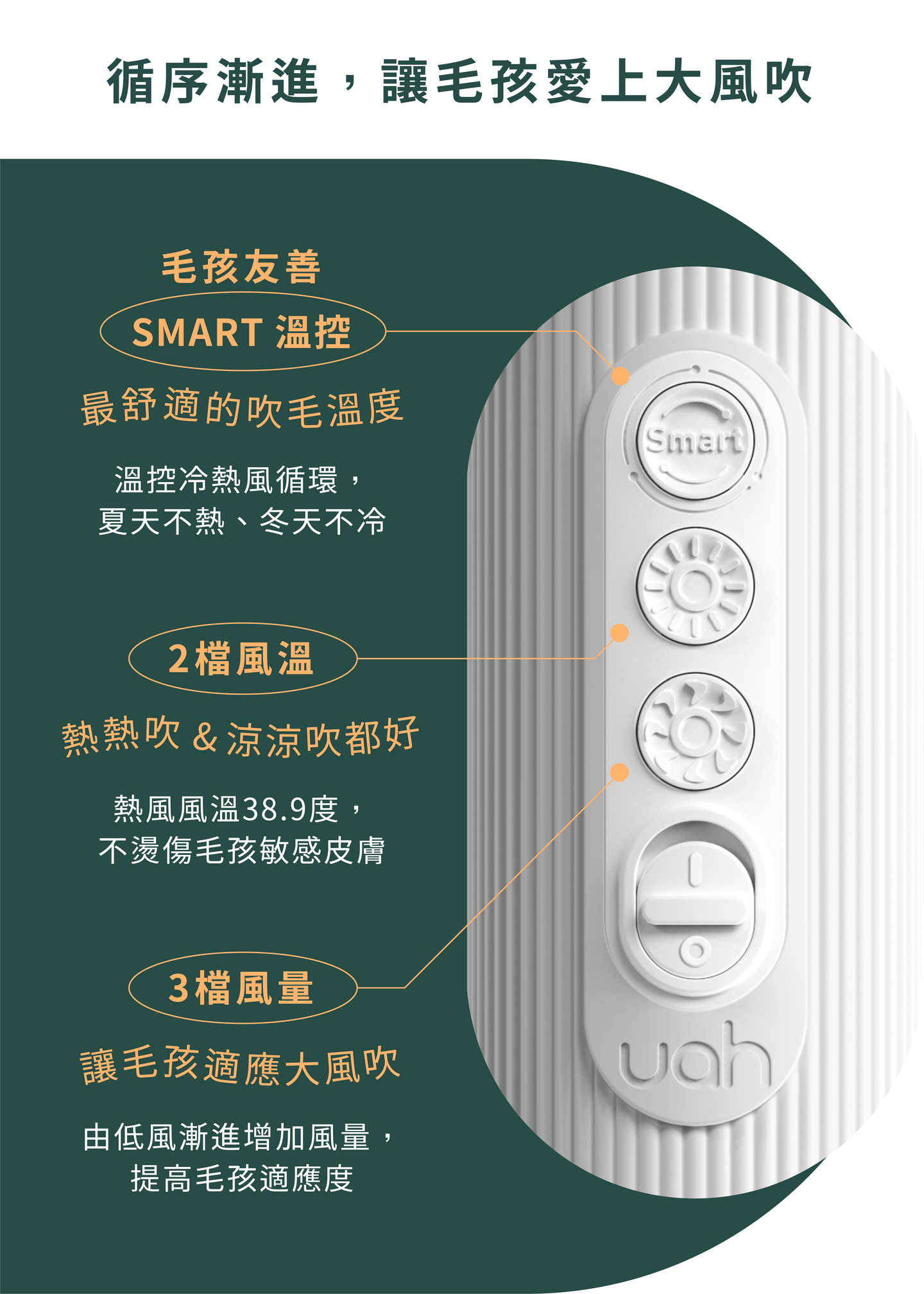 第一支照顧到毛孩和奴才需求的吹水機,僅有 460 克的重量,輕盈、質感一身具備,吹出的溫度最高僅有 38.9°C,低溫不讓毛孩皮膚刺激,附有 3 種不同吹頭,可以在各種部位靈活運用,讓吹毛變成一件輕鬆、簡單的事!