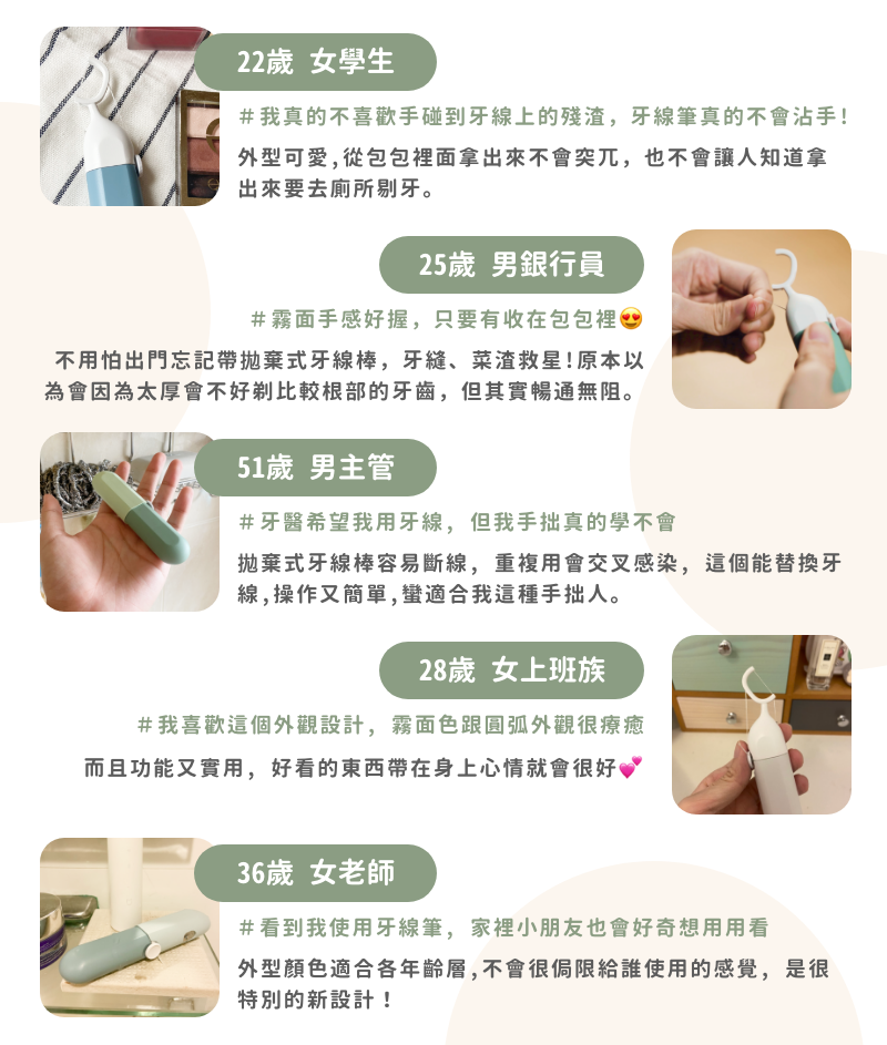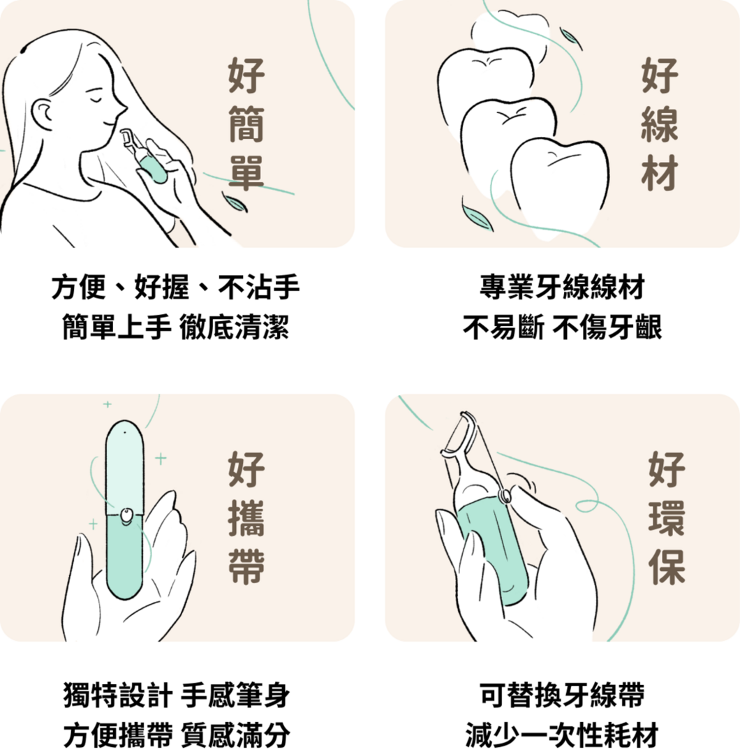 結合「牙線」與「牙線棒」優點於一身的牙線筆,只要旋轉替換帶上的旋鈕,就能不斷拉出新的牙線,這個設計,不僅能讓每顆牙齒都被獨立清潔,也能讓好好潔牙變得更加從容。