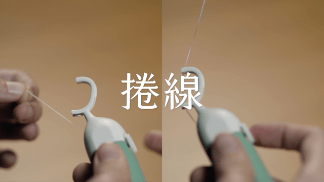 • ① 捲線:旋轉旋鈕將牙線拉出。