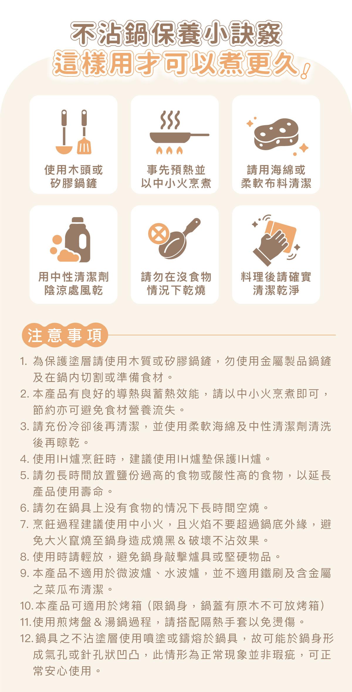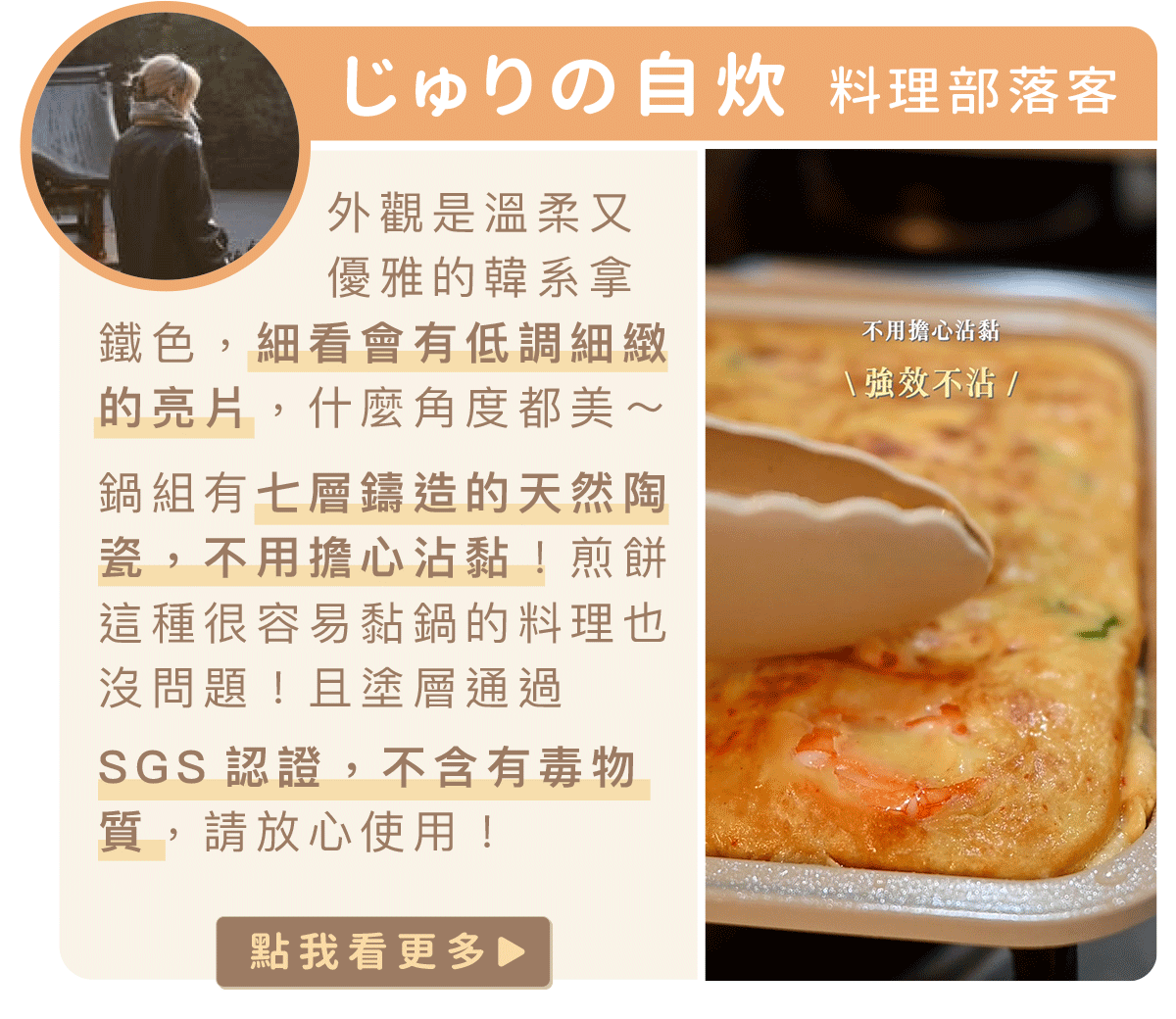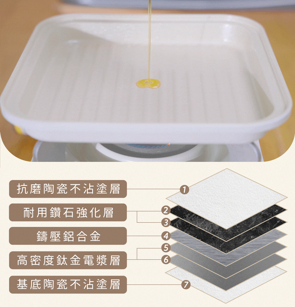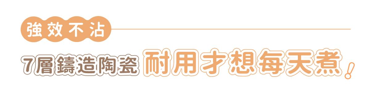 耐用的七層鑄造結構,搭配表層天然陶瓷塗層,堅固耐用又兼具強效不沾,讓你天天開煮無負擔,無論是煎、炒、煮、烤都能完美料理!