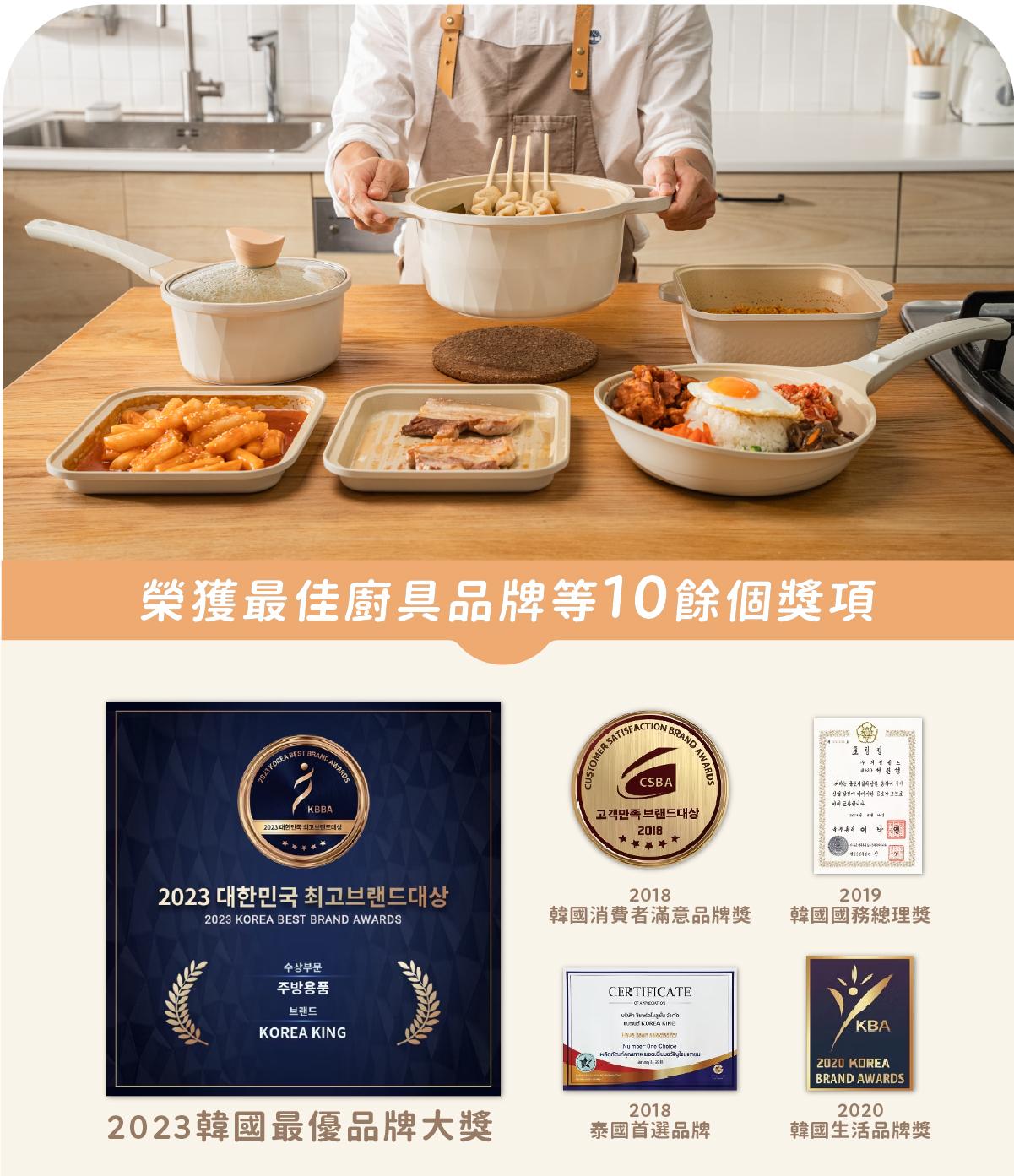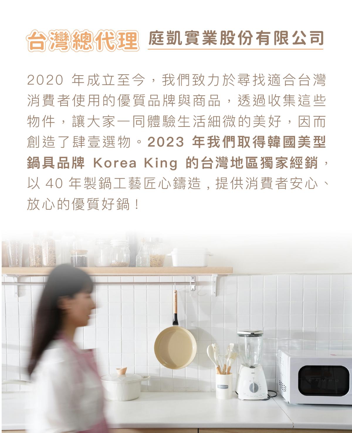 Korea King 創立於 1984 年,擁有超過 40 年的鍋具及生活用品製造經驗。其產品線涵蓋全球 23 個國家, 1998 年達到銷售額突破 1800 萬美元的紀錄。致力於創新天然科技抗刮塗層、高效蓄熱技術及美型設計,並以卓越的鍛造工藝為韓國眾多知名品牌提供研發及代工服務。