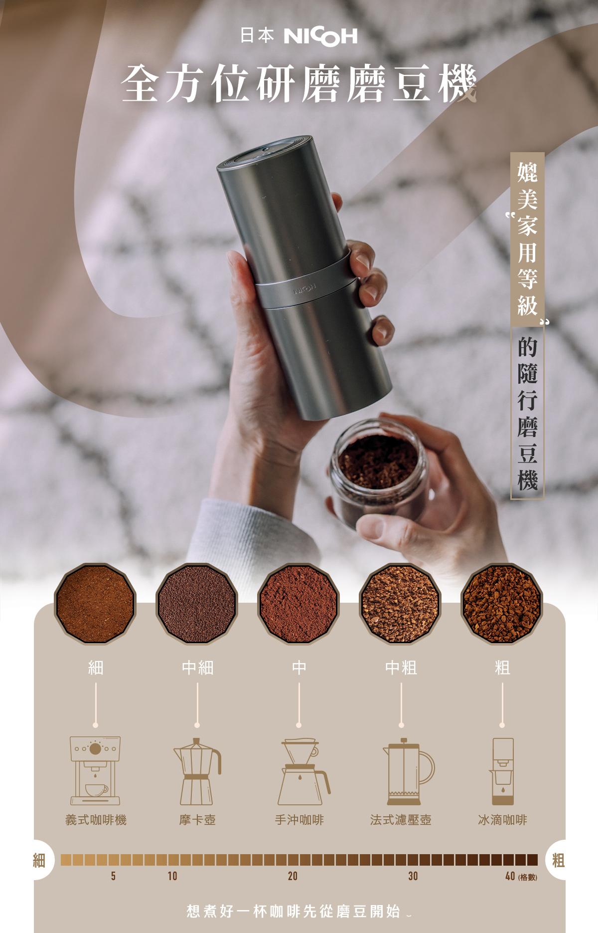 煮好一杯咖啡,咖啡粉的粗細絕對不能隨便。NICOH 選用 40 段的可調節錐刀研磨,均勻細緻,可以滿足各類型咖啡需求。