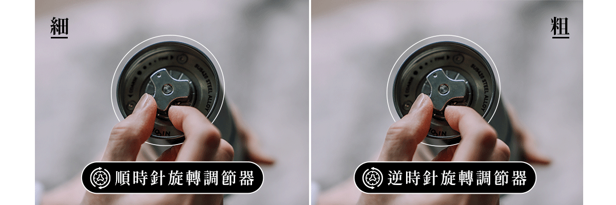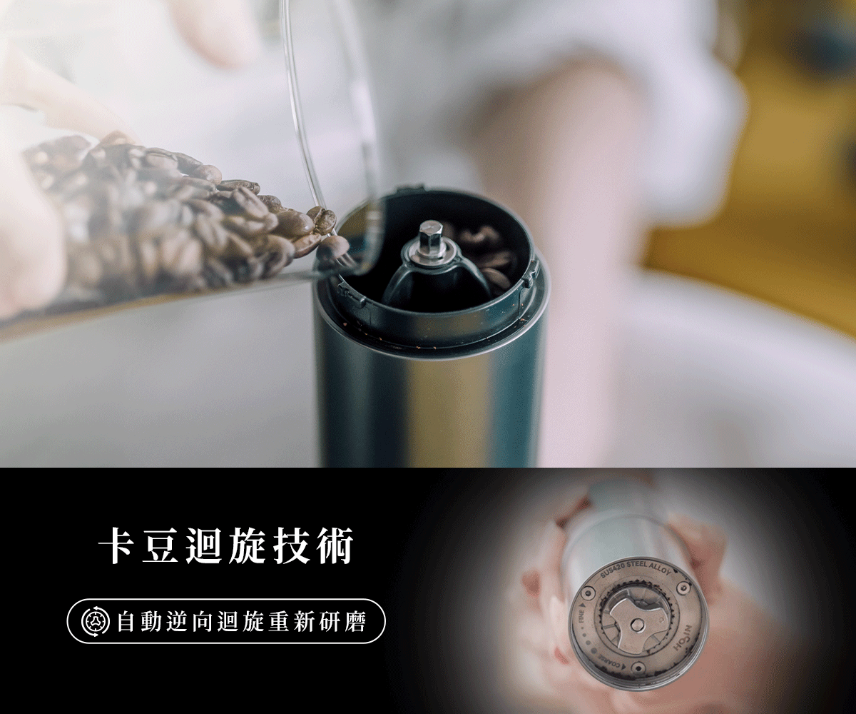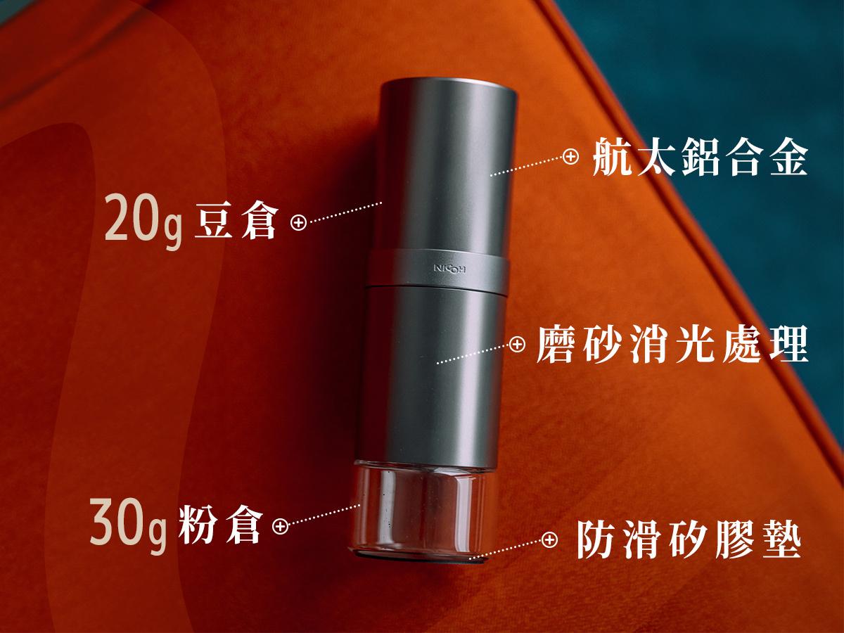 產品機身以航太級鋁合金打造,磨豆機外身經過細膩的磨砂處理後呈現消光金屬質感;使用旋轉卡扣設計,無論是機身、豆倉、粉倉都可以輕鬆拆解。