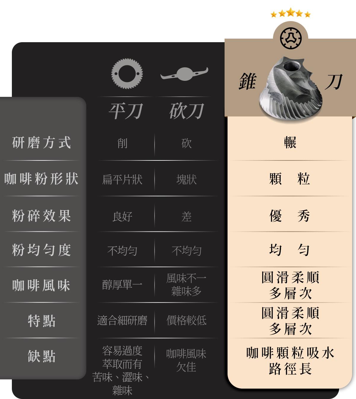 星型直流減速馬達使運轉更加順暢,再也不擔心擾人磨豆聲影響品味興致,同時擁有穩定的 15,000 RPM 低轉速,不易發熱也能避免影響咖啡風味。