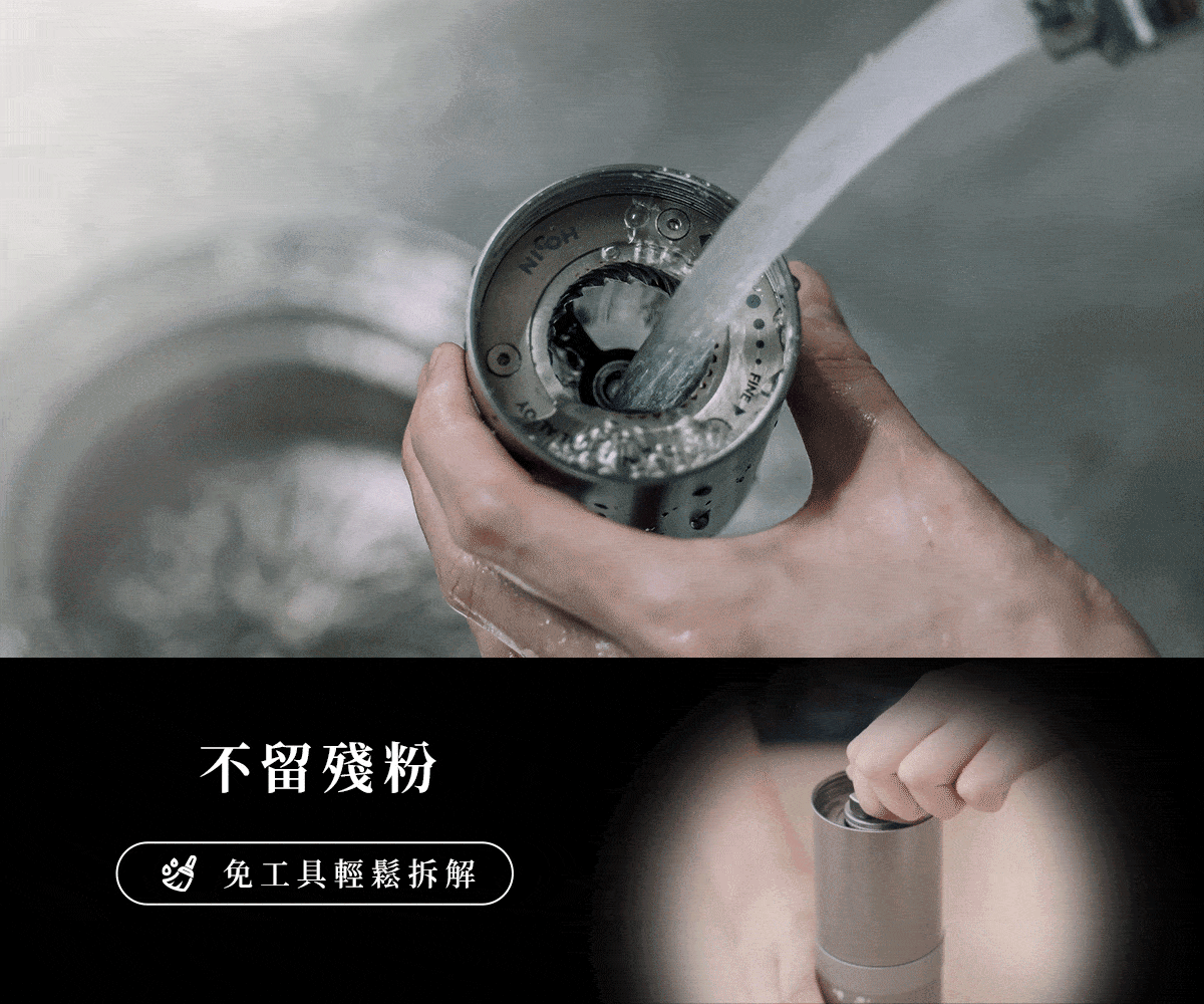 豆倉以及粉倉都可以直接沖洗,只要打開粉倉,將刀頭旋轉到底即可卸下,拆洗磨豆機再也不用哩哩扣扣的工具。