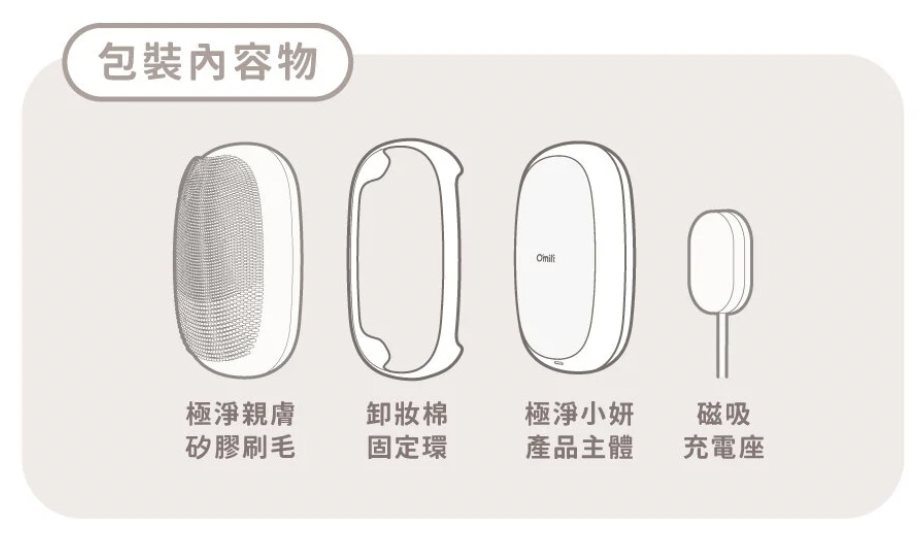 內容物:主機、磁吸充電座、矽膠刷毛、卸妝棉固定環、說明書