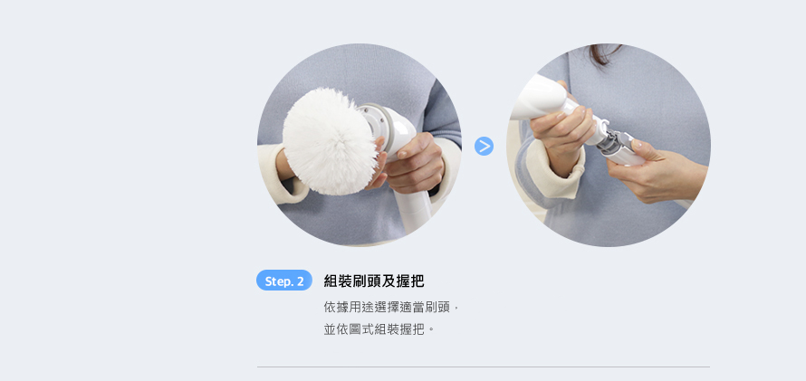 2. 組裝刷頭及握把,依據用途選擇適當刷頭,並依圖示組裝握把。