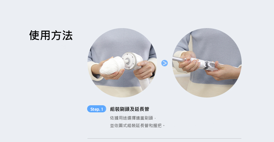 1. 組裝刷頭及延長管,依據用途選擇適當刷頭,並依圖示組裝延長管和握把。