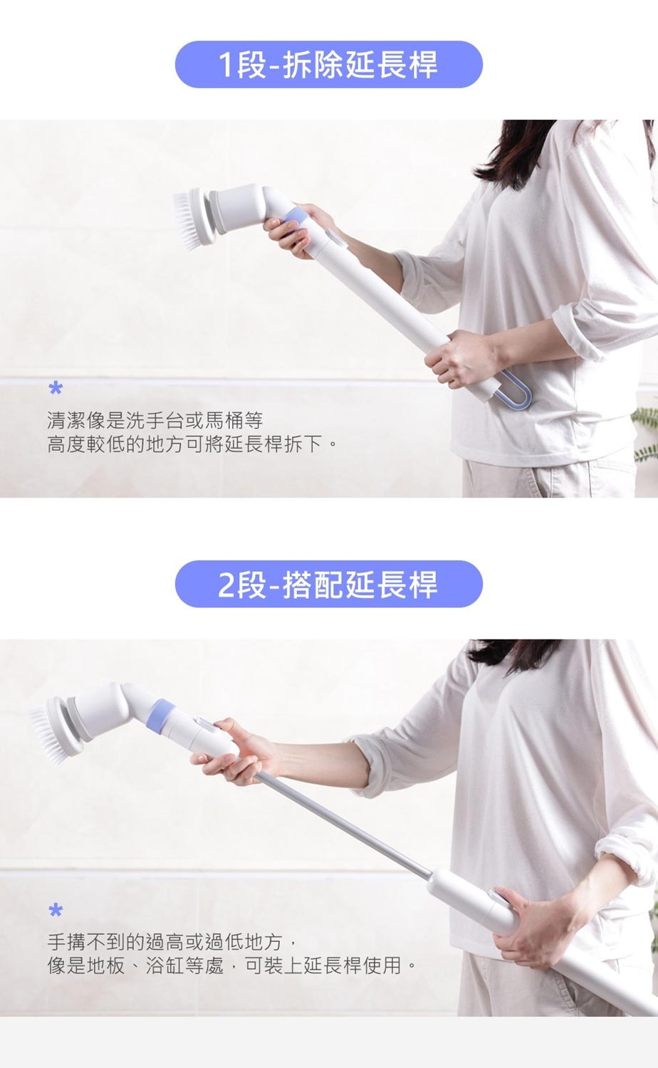 難以接近的浴室高牆、地面深處、浴缸死角,可以搭配延長管使用,過去用手清理不到的地方也能仔細清潔了!平日想隨手清理洗手台或馬桶時,也可以拆除延長管一般使用。