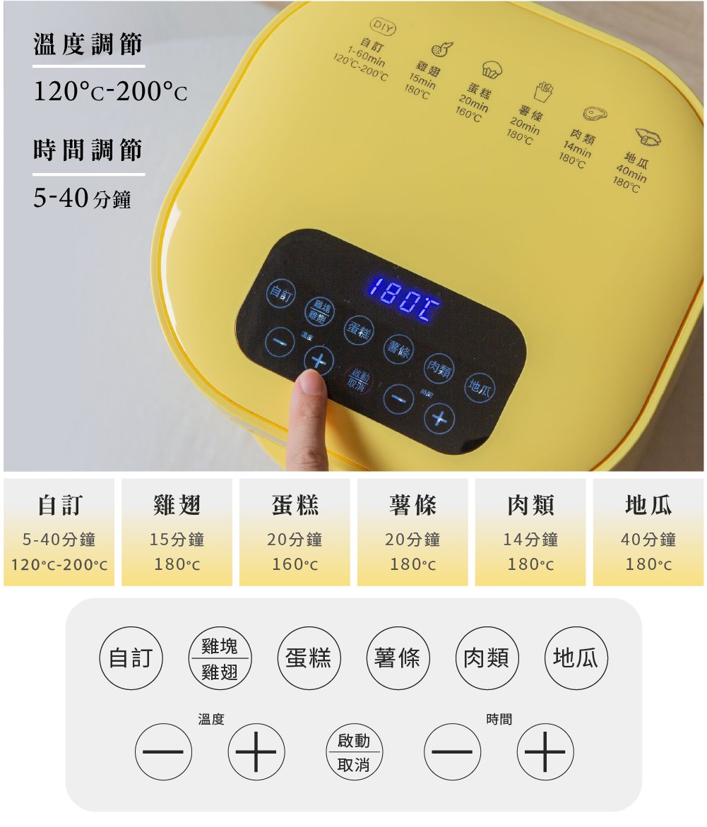 一機多用,自由調節 120°C~200°C 烘烤溫度與時間定時可達 40 分鐘,打造炸、烤、烘、煎等多樣化餐點。