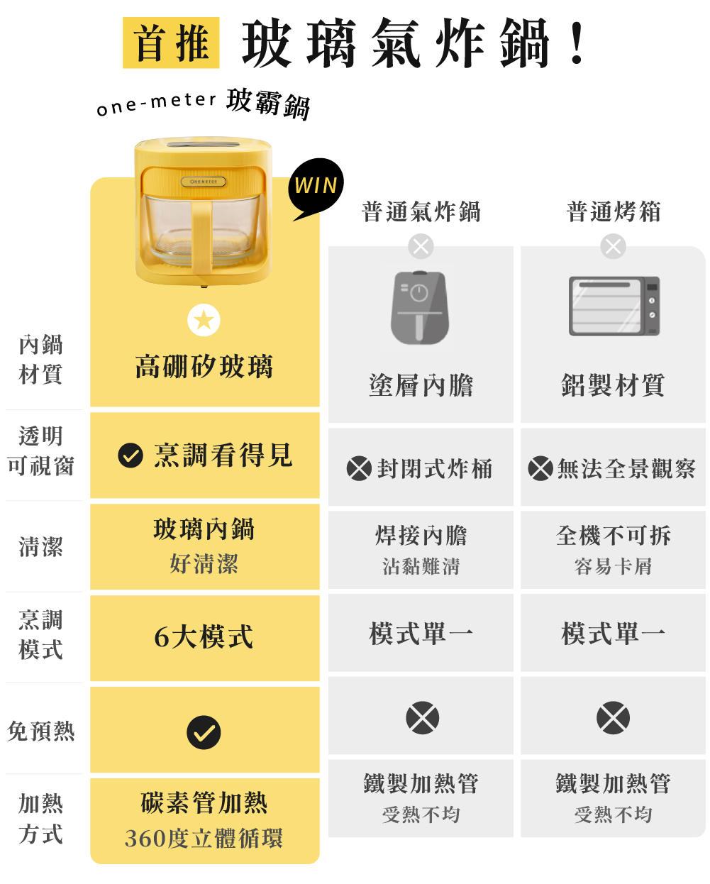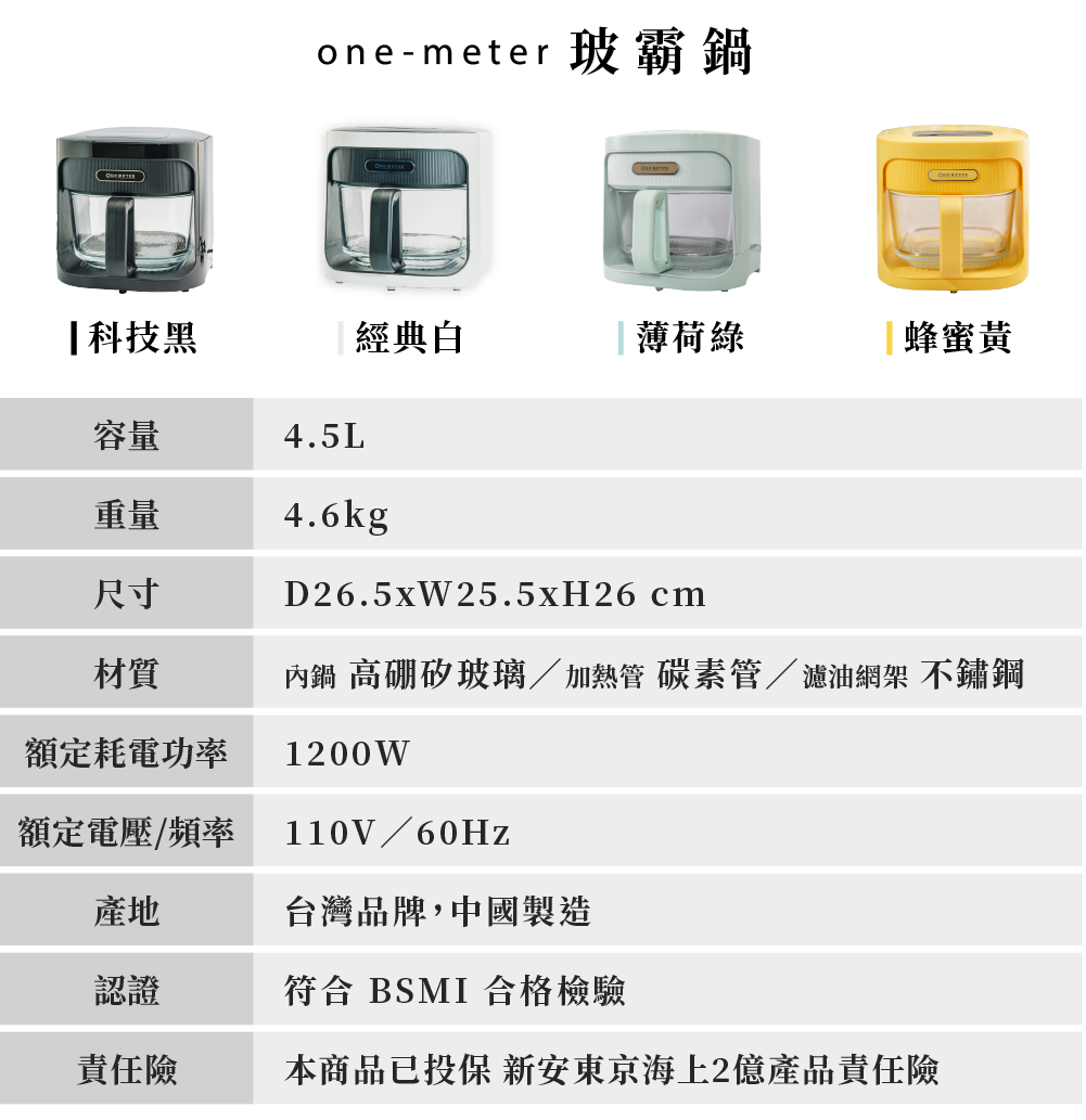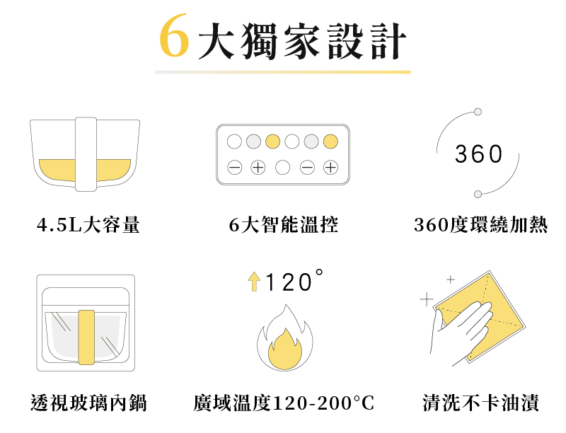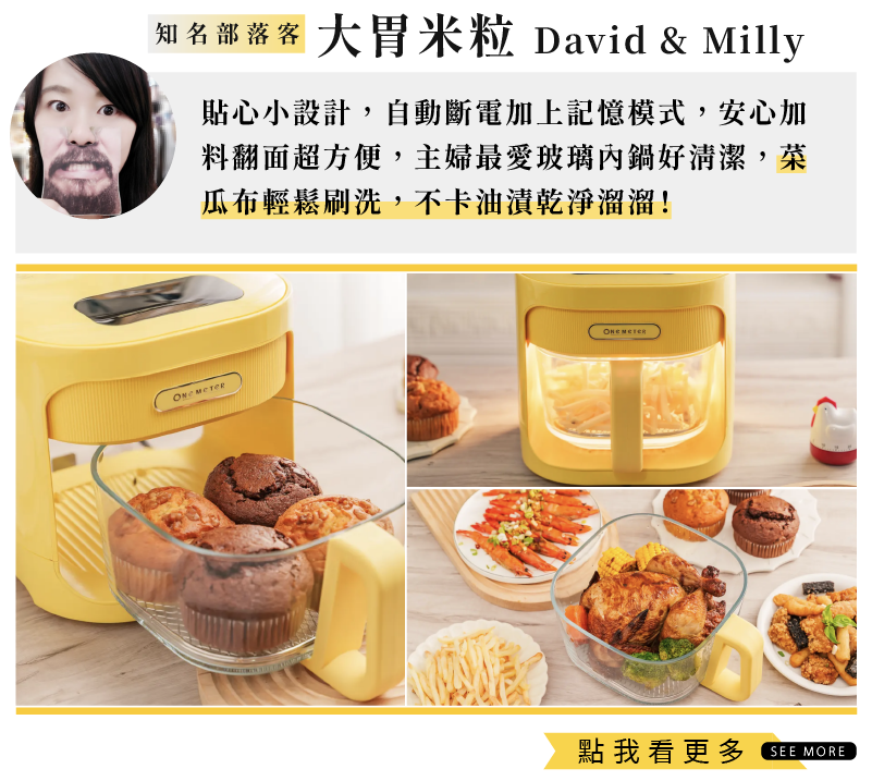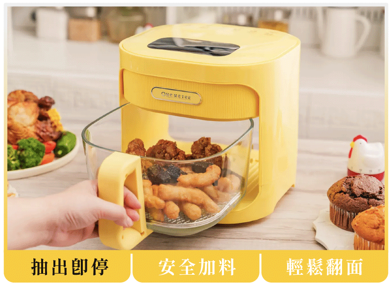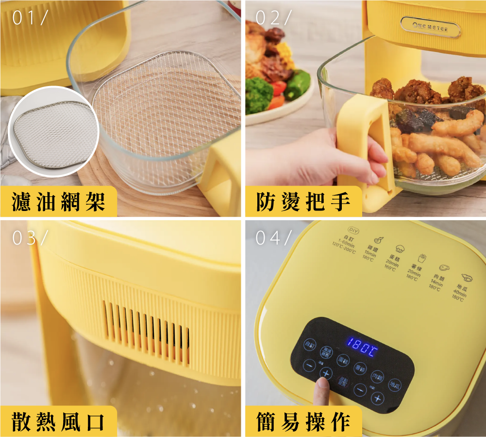 全新升級 4.5L 超大容量,料理全家人的份量也沒問題,煎、烘、炸、烤,一鍋就搞定!透明玻璃設計,更方便掌握料理過程;高硼矽玻璃耐高溫、安全無塗層,同時解決了傳統氣炸鍋不易清潔的痛點!
