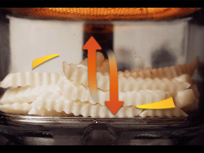 藉由 360 度的立體熱風循環,高效加熱且使食物均勻地受熱,以「氣炸」代替「油炸」,烘烤出健康又美味的食物,減少脂肪熱量與油膩感。