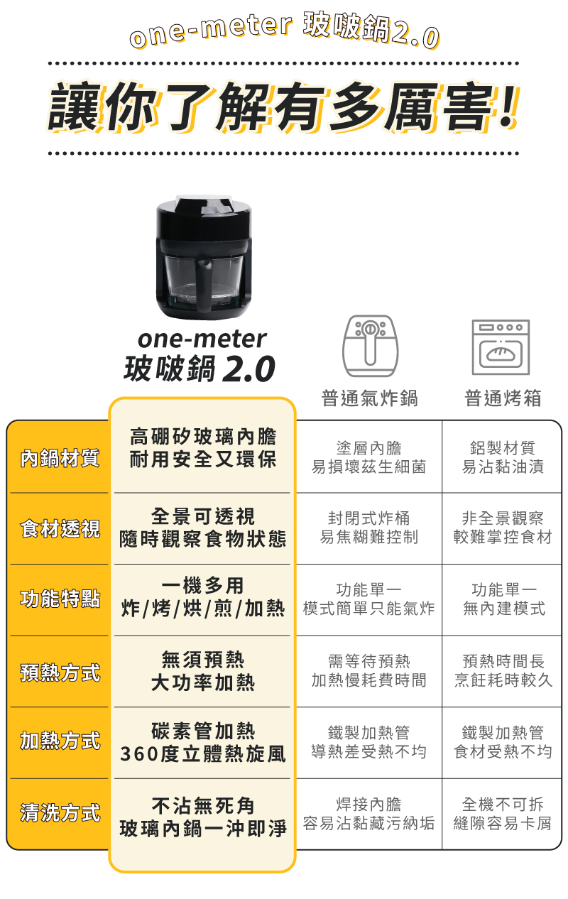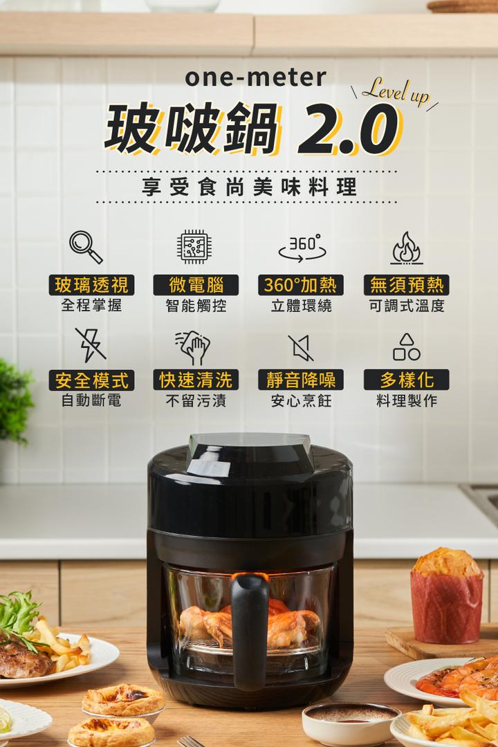 one-meter 玻啵鍋2.0 內鍋採耐熱玻璃材質設計,不僅更方便掌握料理進度,也能解決傳統氣炸鍋不易清潔的麻煩。