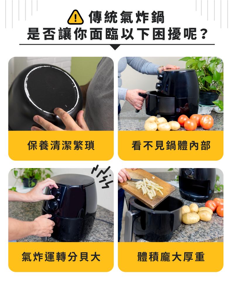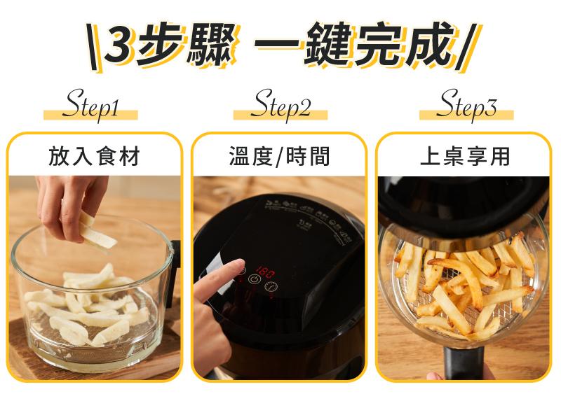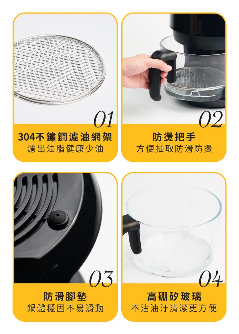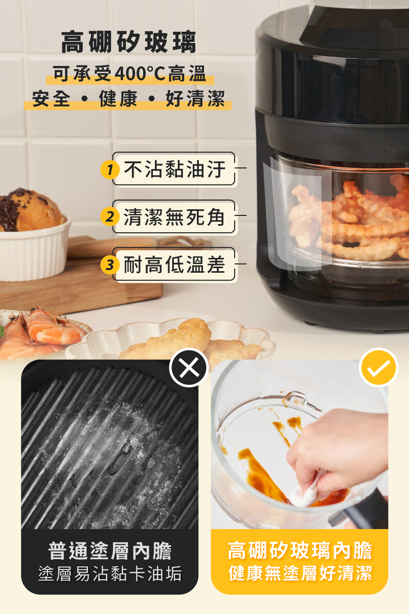 清洗方便,隨附配件皆可拆出清洗,玻璃材質免去傳統油炸後續清理,清潔便利又環保。