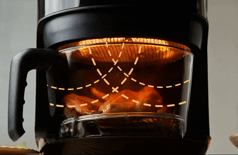 藉由 360 度的熱空氣循環,one-meter 玻啵鍋2.0 能讓食物快速且均勻地受熱,以「氣炸」代替「油炸」,烘烤出健康又美味的食物,減少脂肪與熱量。