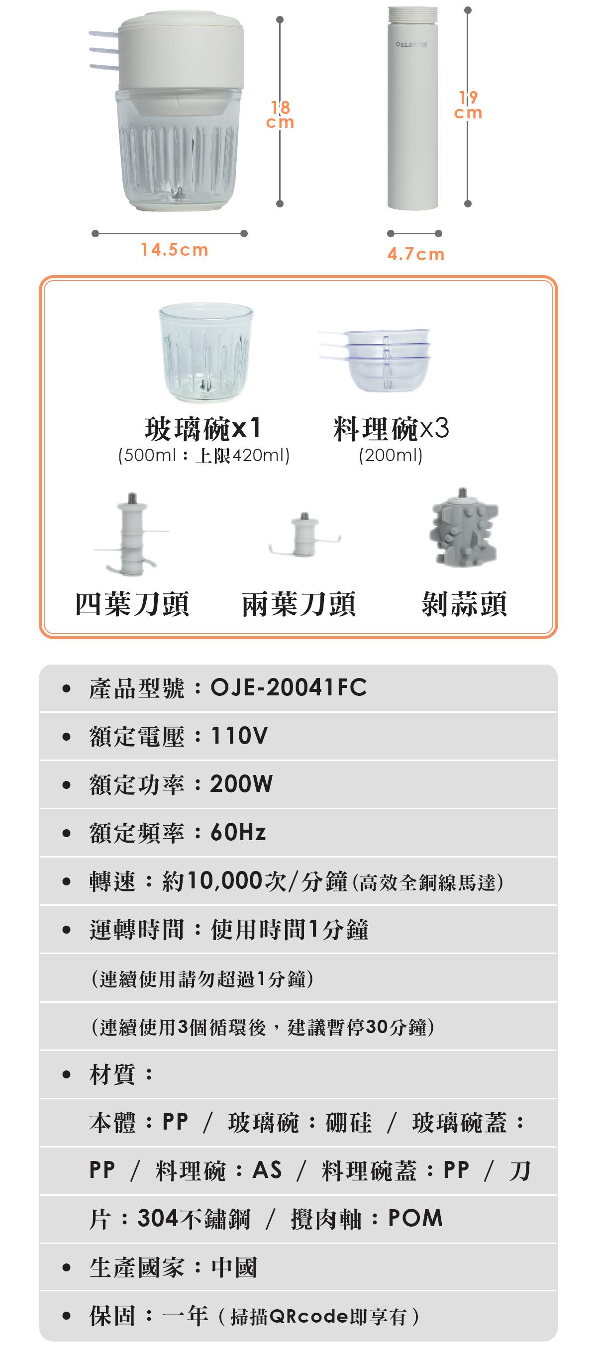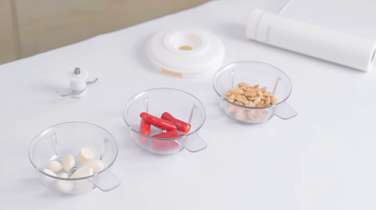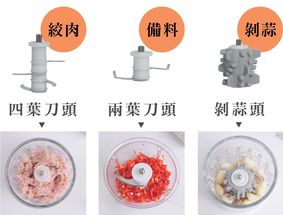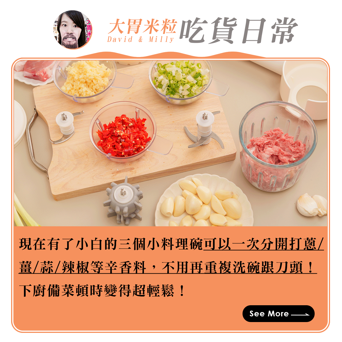 小白擁有兩葉、四葉的不鏽鋼刀片與剝蒜頭,可依料理需求分別處理生熟食材:四葉刀頭搭配大碗可打絞肉,兩葉刀頭搭配小碗可製作佐料,加上特殊的下沈式刀片設計,就算量少也難不倒他!包餃子、做醬料一次就能搞定!