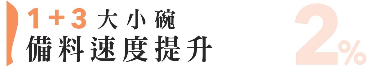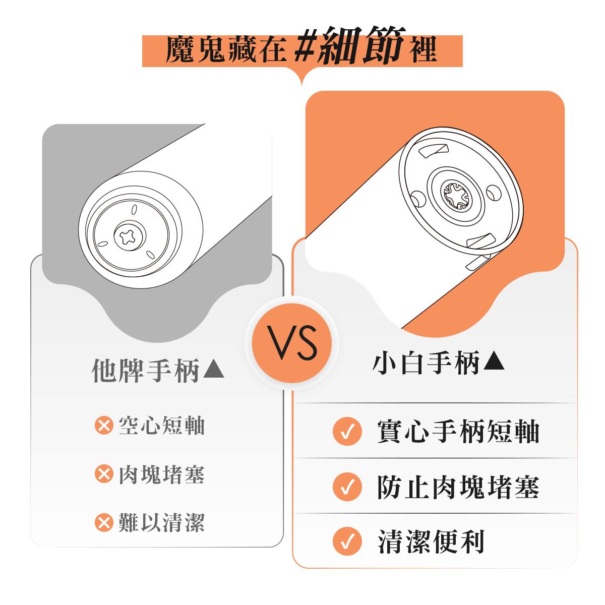小白附有三種可分離式刀頭,搭配 1+3 的四碗配置,食材可分開製作,即換即打,不僅備料效率大幅提升,還能避免交叉污染的風險!