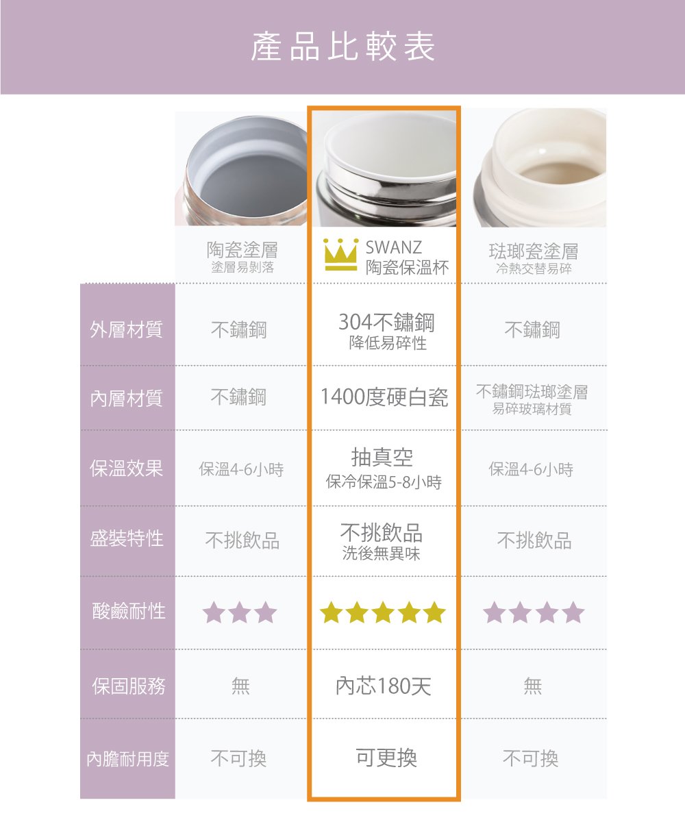 Swanz 陶瓷保溫杯是一體成型的高溫燒製陶瓷製成,與陶瓷塗層不同,更耐酸鹼且不會掉漆,搭配 304 不鏽鋼真空外層,保溫效果更好!內芯還有保護更換。