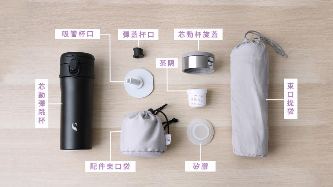 內容物:芯動彈跳杯x1、專用矽膠吸管x1、芯動杯旋蓋x1、茶隔x1、配件束口袋x1