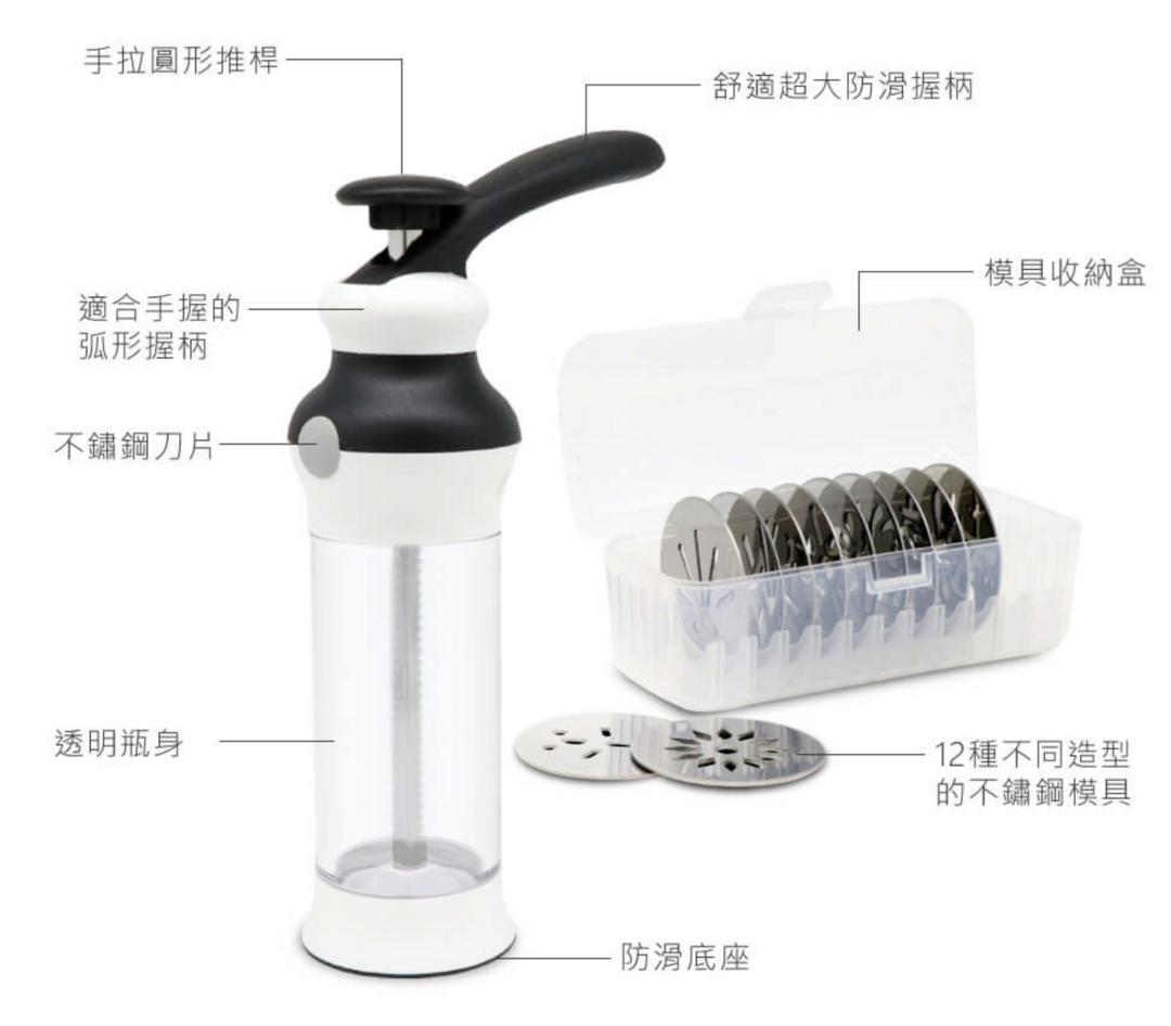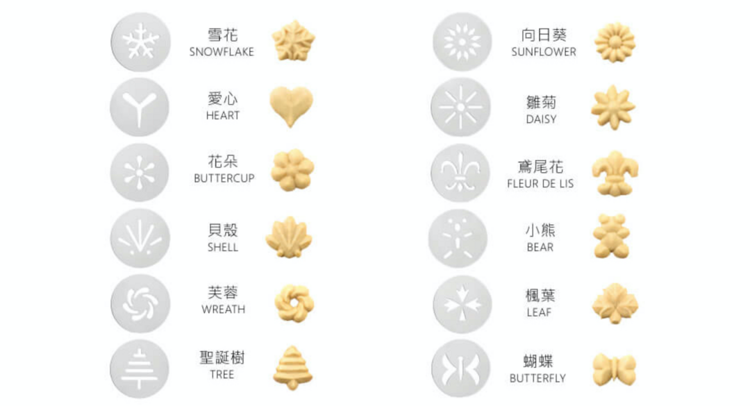 使用簡單的槓桿原理來製作簡單的家常餅乾,內容包括 12 個不鏽鋼圖案盤,讓烘焙生活更有趣味!