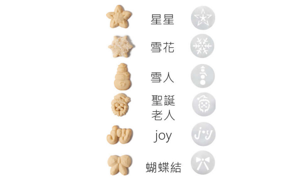 聖誕節系列的六款餅乾擠壓模型盤,可以自由裝飾你的小雪人、聖誕老人,製作出最符合節日氣氛的餅乾點心。