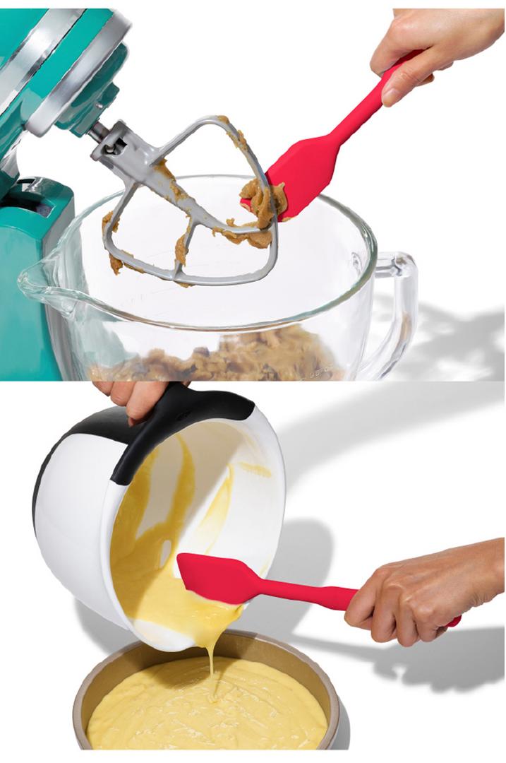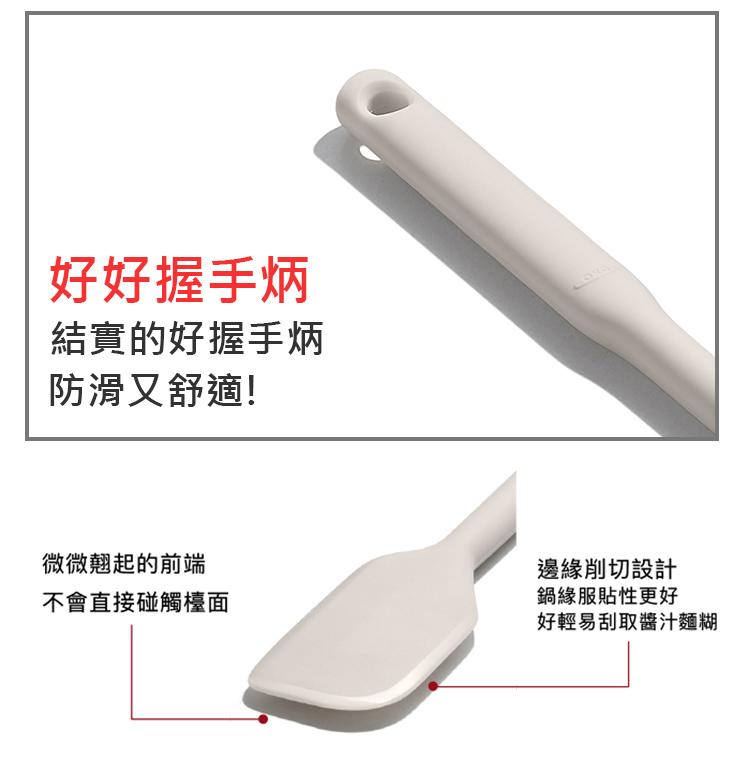 不同於一般的橡膠刮刀它能保持柔韌性、不變色或熔化,並易於清潔、耐高溫、不粘鍋具。柔軟的防滑手柄不論在你烹飪、攪拌或刮起食材時都能十分舒適。