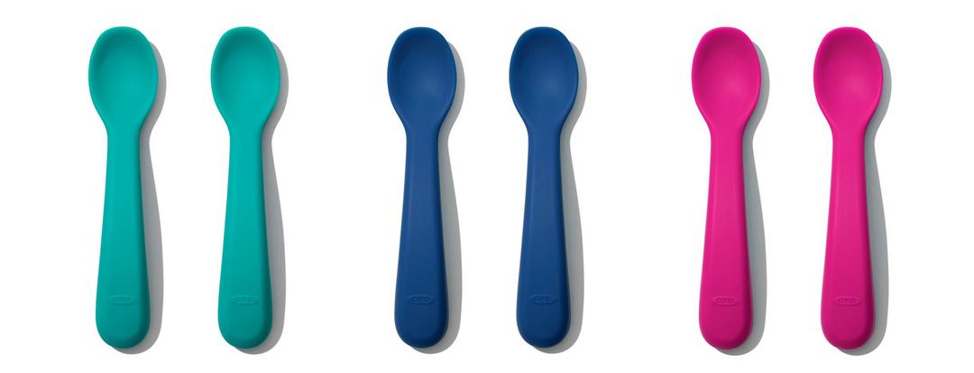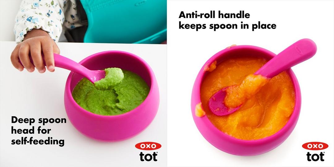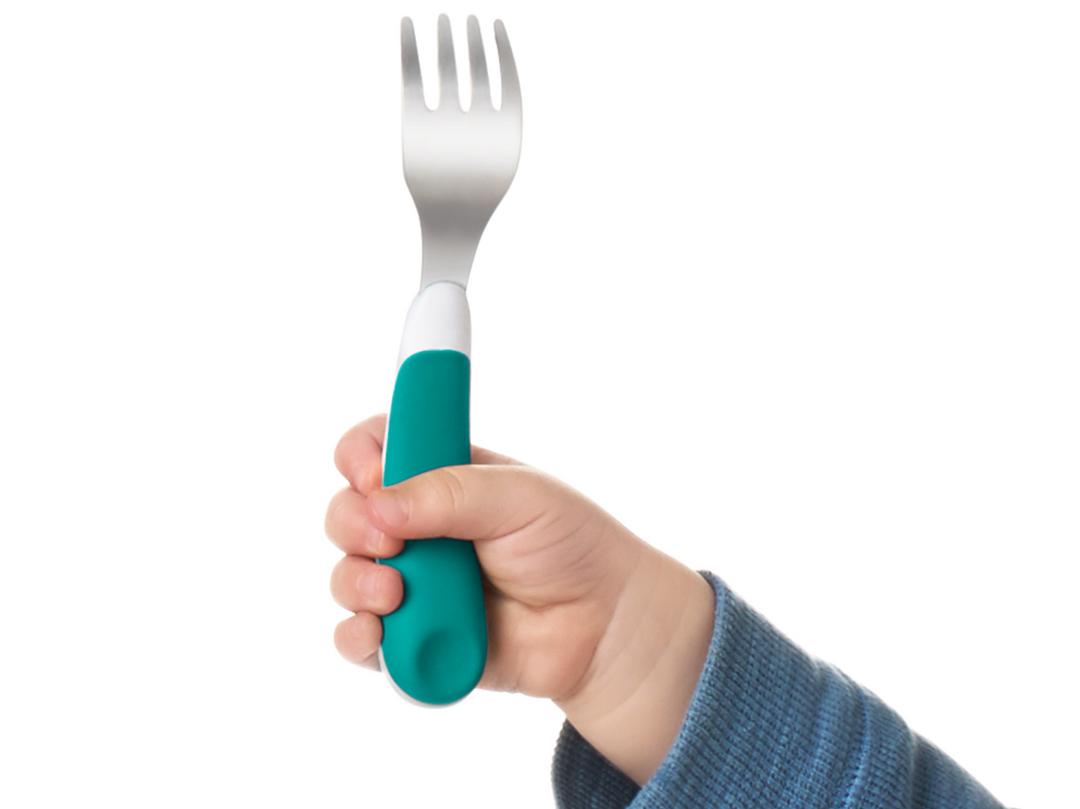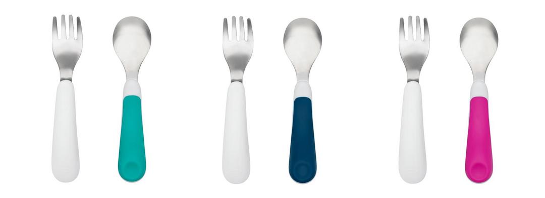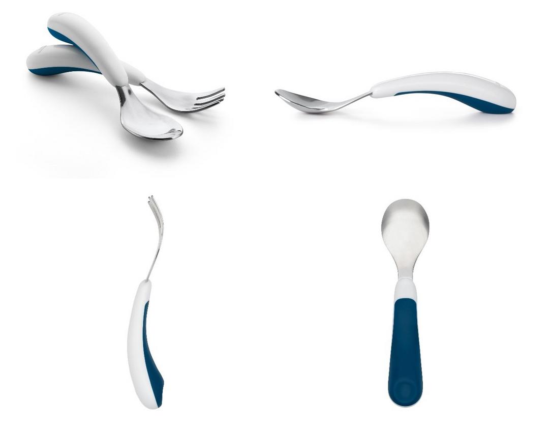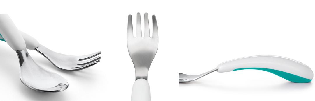 安全無毒的全矽膠表面,經典叉匙組彎曲手柄設計,好掌握不翻車,讓寶寶自己拿,學習自己吃,輕鬆無挫折。