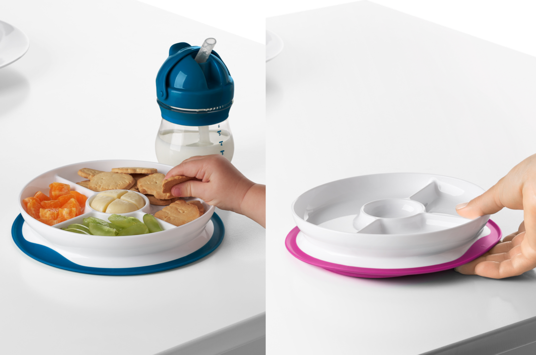 超強吸力吸盤,幫助寶貝練習吃飯時不易打翻。可旋開式設計,吸盤可固定於桌上,用餐時直接將餐盤旋入吸盤,餐後直接旋出餐盤清洗,避免拔取時潑灑食物。