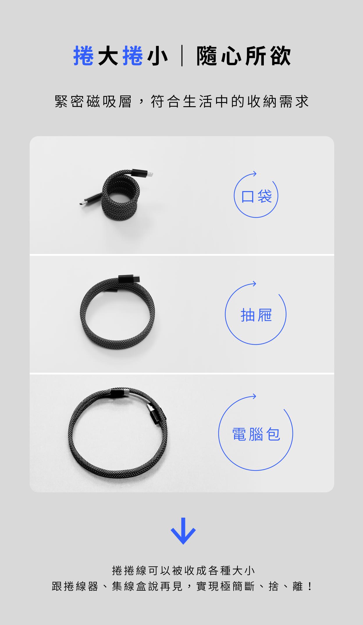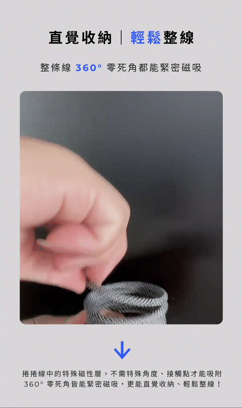 - 360° 磁吸設計,一捲即吸收納整齊
