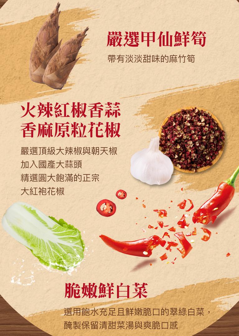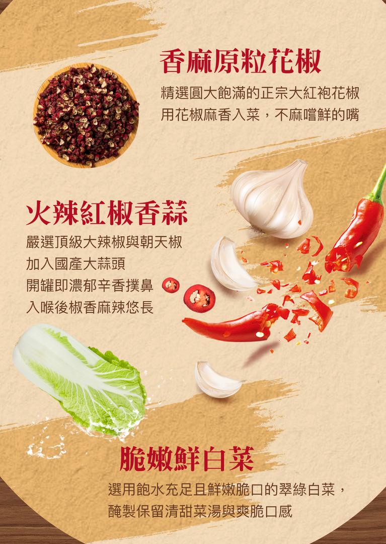 成分:大白菜、花椒、朝天椒、釀造醬汁、糖、糯米醋、大豆沙拉油、蒜頭、辣椒、香油、胺基乙酸、檸檬酸、(維他命 C、混合濃縮生育醇)抗氧化劑