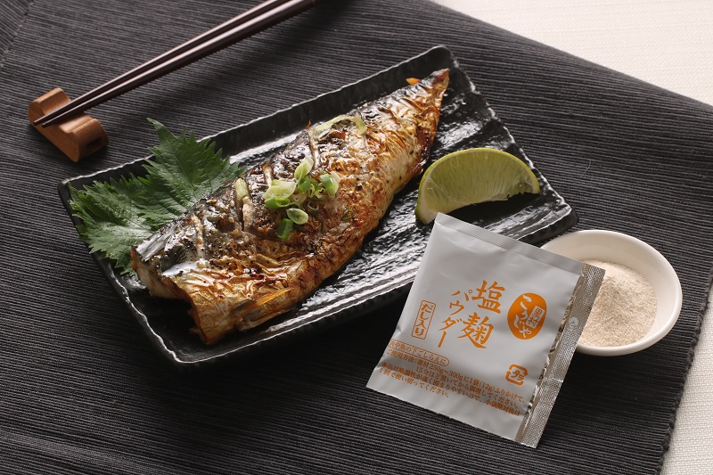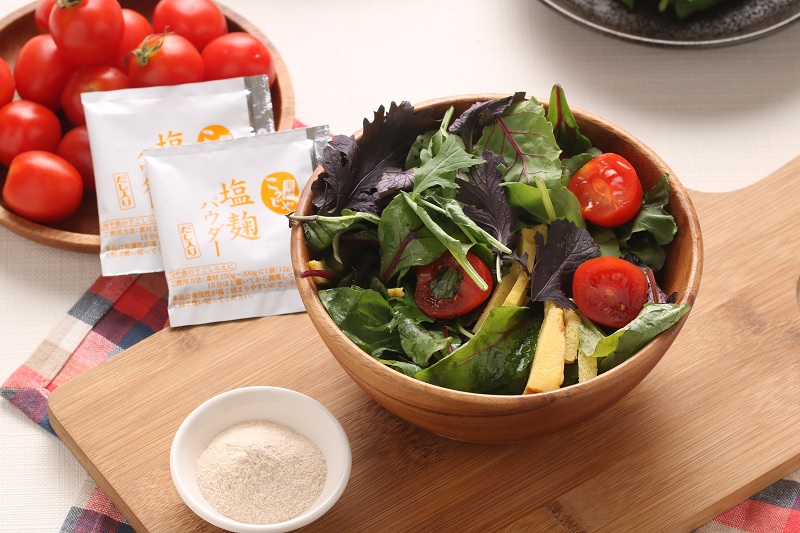 乾燥粉末狀鹽麴,內含純天然的湯頭。將濕潤的鹽麴製作成乾燥的粉末狀,除了活生生的酵素可讓食材更美味,還加入鰹節、昆布、椎茸、鯖節等湯頭基底,賦予鹽麴粉的味道更多道層次。