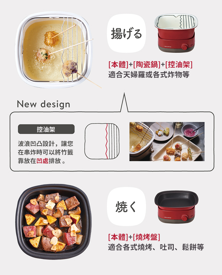 內容物:主機、上蓋、陶瓷鍋、燒烤盤、控油架、蒸架、21 道專用精緻食譜