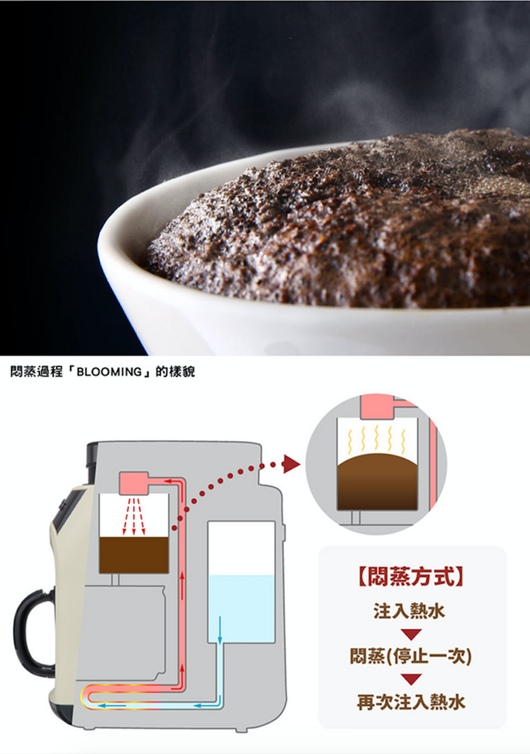 仿手沖「悶蒸程序」可讓咖啡的香味更加濃郁,當咖啡機開始濾煮行程時,會先注入少量熱水,咖啡粉會開始膨脹排出多餘氣體,之後進行第二次沖煮,可萃取出更多的咖啡風味,達到手沖職人的咖啡等級!