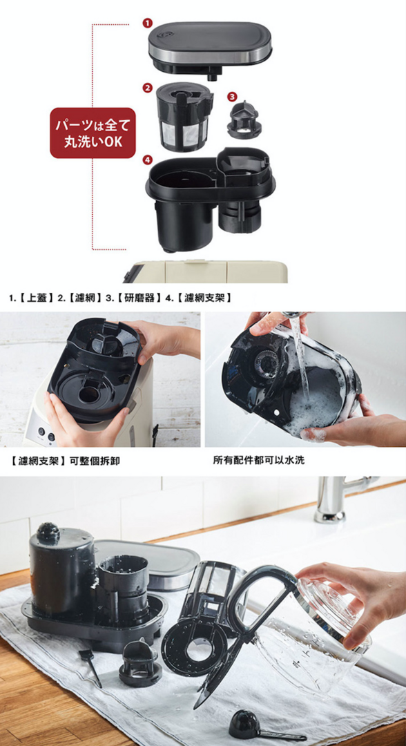 所有配件皆可拆卸水洗,清潔便利,不論是上蓋、濾網、研磨器、濾網支架或玻璃咖啡壺都可以拆下清洗。